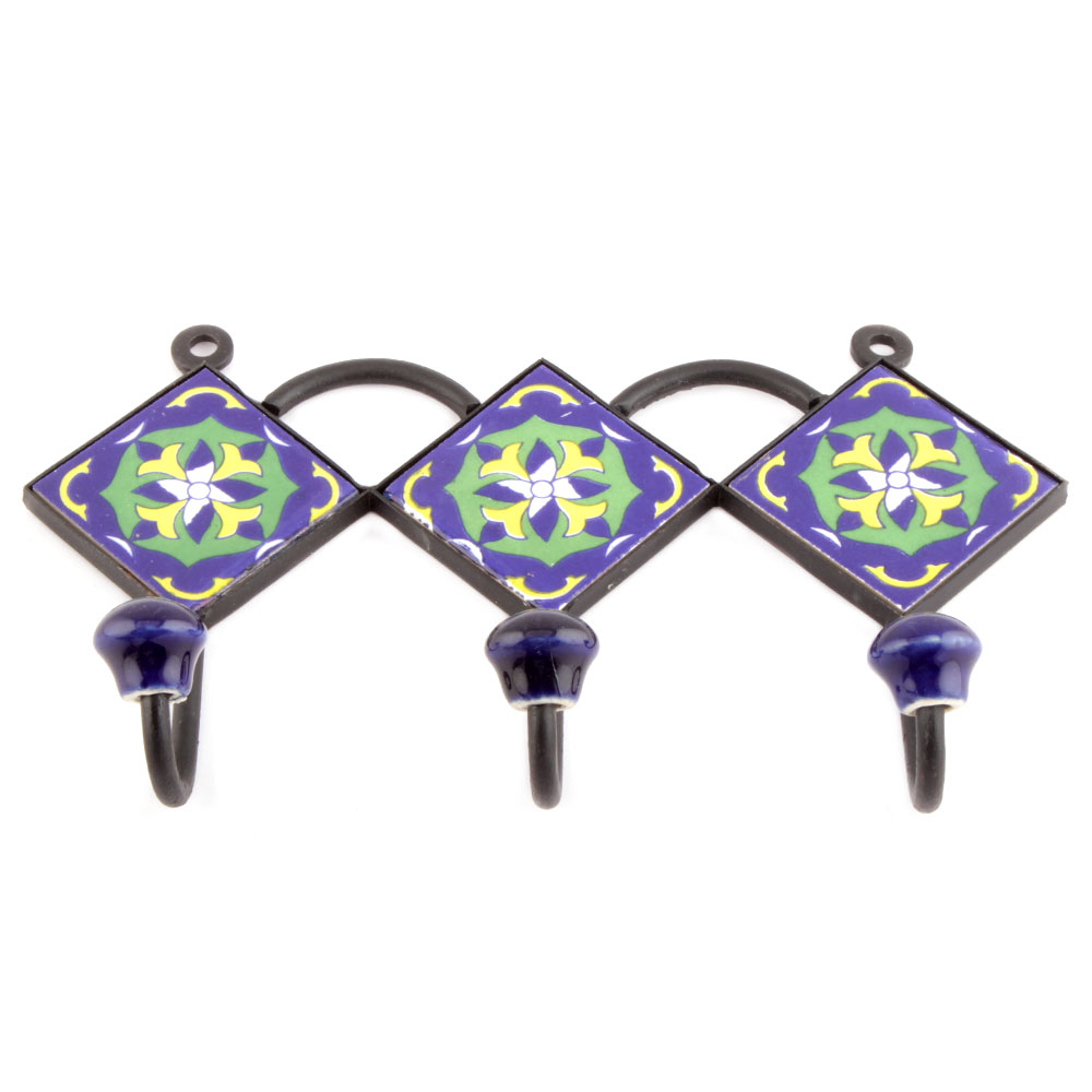 Navy Blue Lime Green Floral Tiles Hooks. When Put on Wall or Cabinet it is an Art in itself. The Metal Part of this Hook is Black Powder Coated.