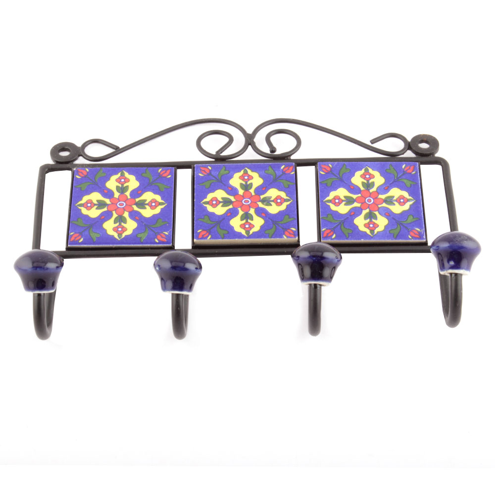 Navy Blue Red Tiny Flower Tiles Hooks. When Put on Wall or Cabinet it is an Art in itself. The Metal Part of this Hook is Black Powder Coated.