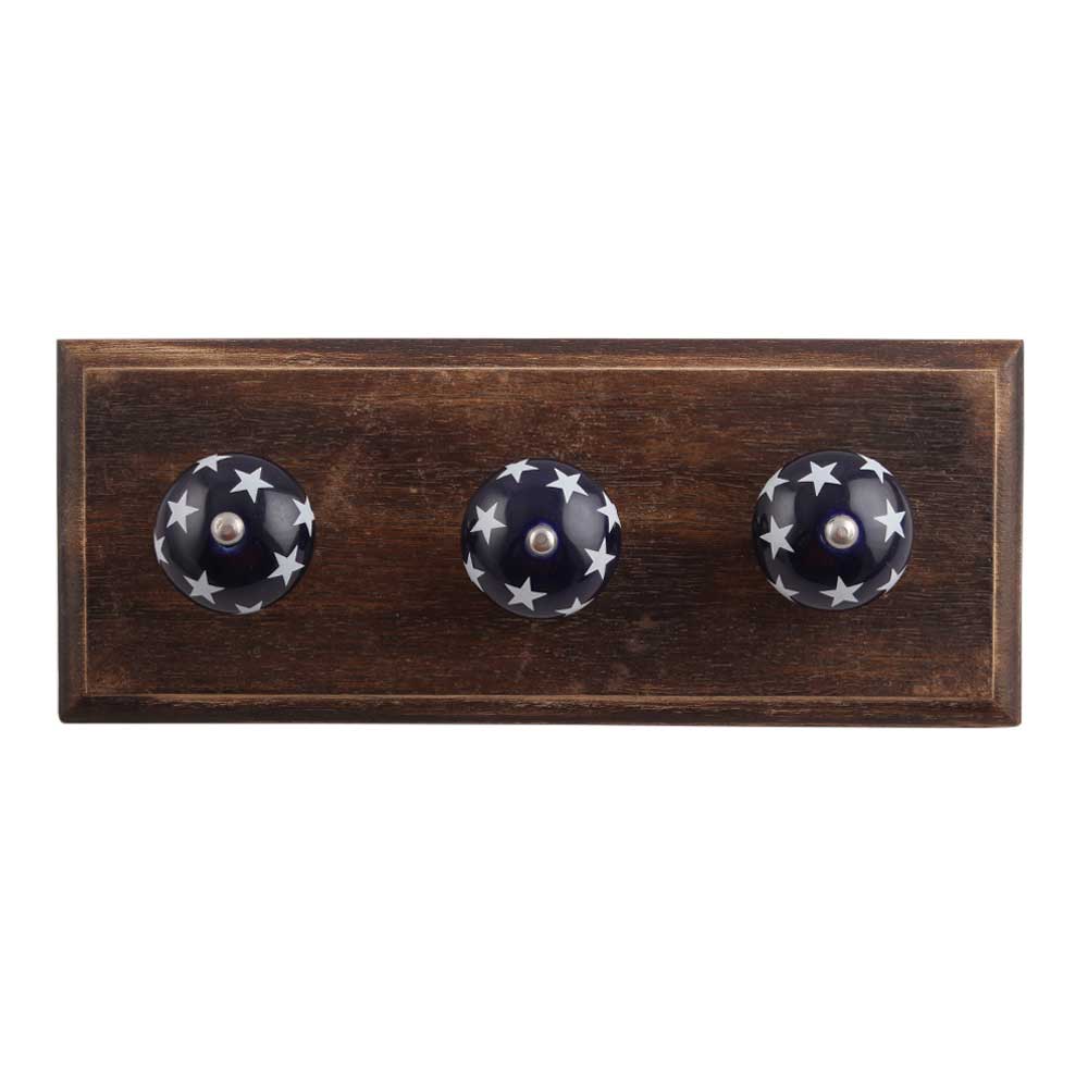 Navy Blue Star Ceramic Wooden Hook. A Perfect Complement to the Soft Tone of the Wood are these White Traditional Hat Coat Hook Made of Genuine Porcelain and Brass. It can be use to Hang Jewellery, Leashes, Towels, Scarves, Light Weight Sweaters, Caps Etc.