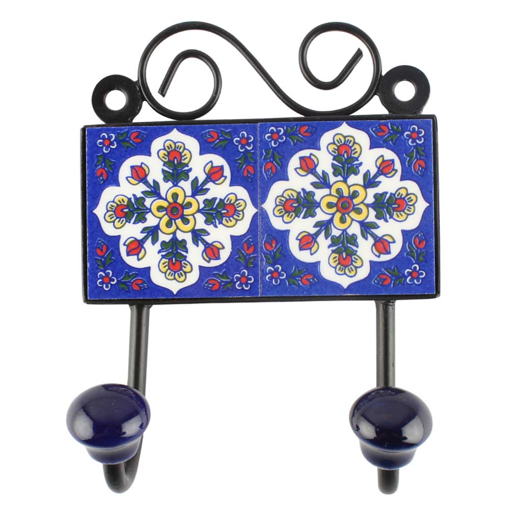 Navy Blue Tiny Flower Ceramic Tile Hook Online. When Put on Wall or Cabinet It is An Art in Itself. The Metal Part of this Hook is Black Powder Coated.