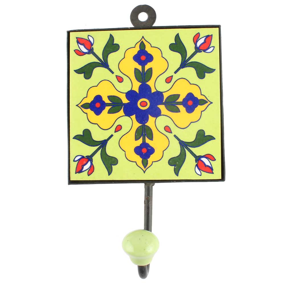 Navy Blue Tiny Flower Ceramic Tile Wall Hook. When Put on Wall or Cabinet It is An Art in Itself. The Metal Part of this Hook is Black Powder Coated.