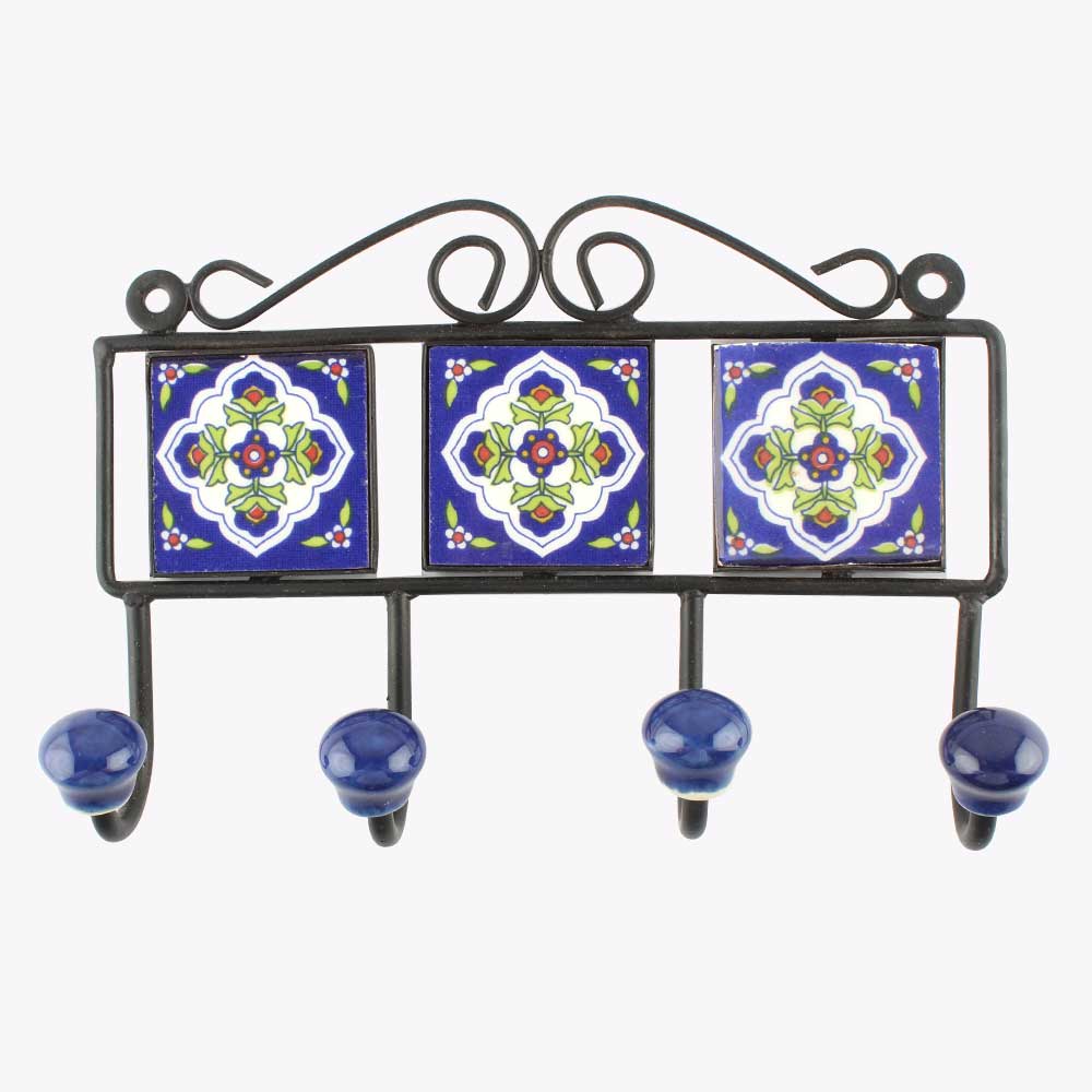 Navy Blue White Ceramic Floral Tiles Hook. When Put on Wall or Cabinet It is An Art in Itself. The Metal Part of this Hook is Black Powder Coated.