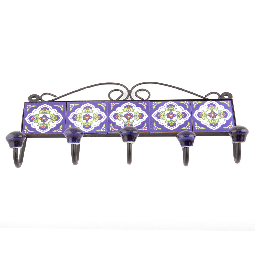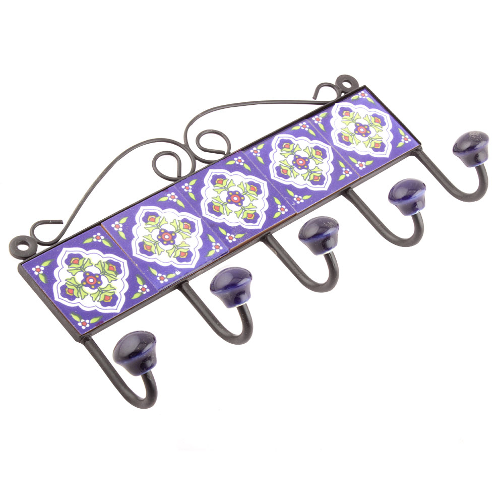 Navy Blue White Floral Tiles Hooks. When Put on Wall or Cabinet it is an Art in itself. The Metal Part of this Hook is Black Powder Coated.