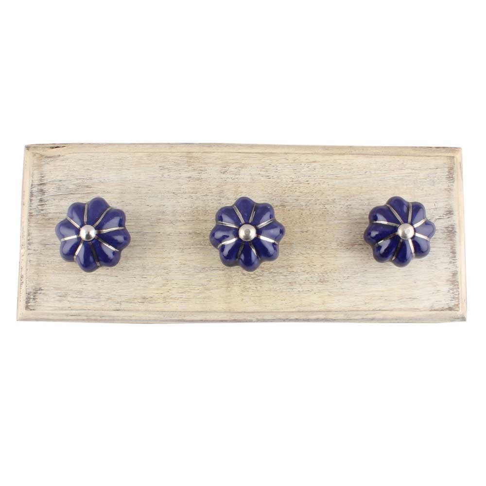 Navy Blue With Silver Line Medium Ceramic Melon Wooden Hooks. A Perfect Complement to the Soft Tone of the Wood are these White Traditional Hat and Coat Hook Made of Genuine Porcelain and Brass. It can be used to Hang Jewelry, Leashes, Towels, Scarves, Light Weight Sweaters, Caps etc.