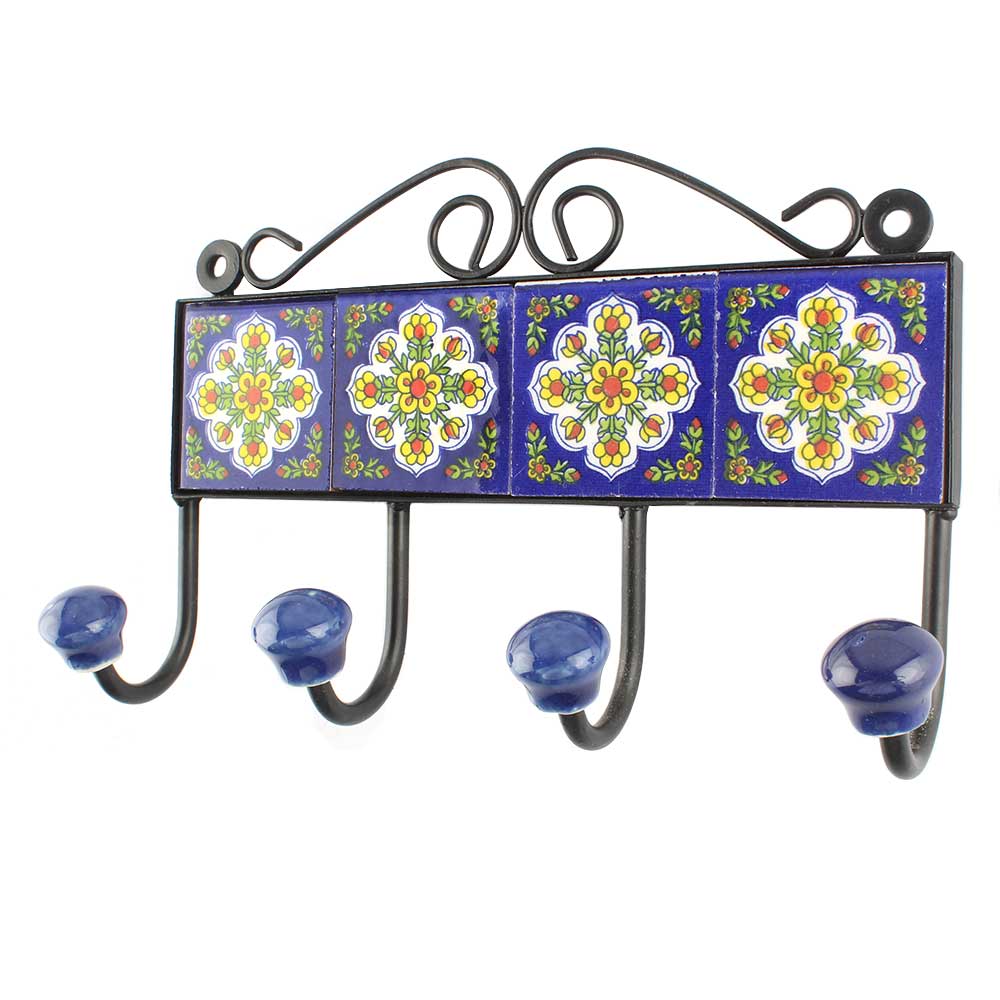 Navy Blue With White Ceramic Floral Tiles Hook. When Put on Wall or Cabinet It is An Art in Itself. The Metal Part of this Hook is Black Powder Coated.