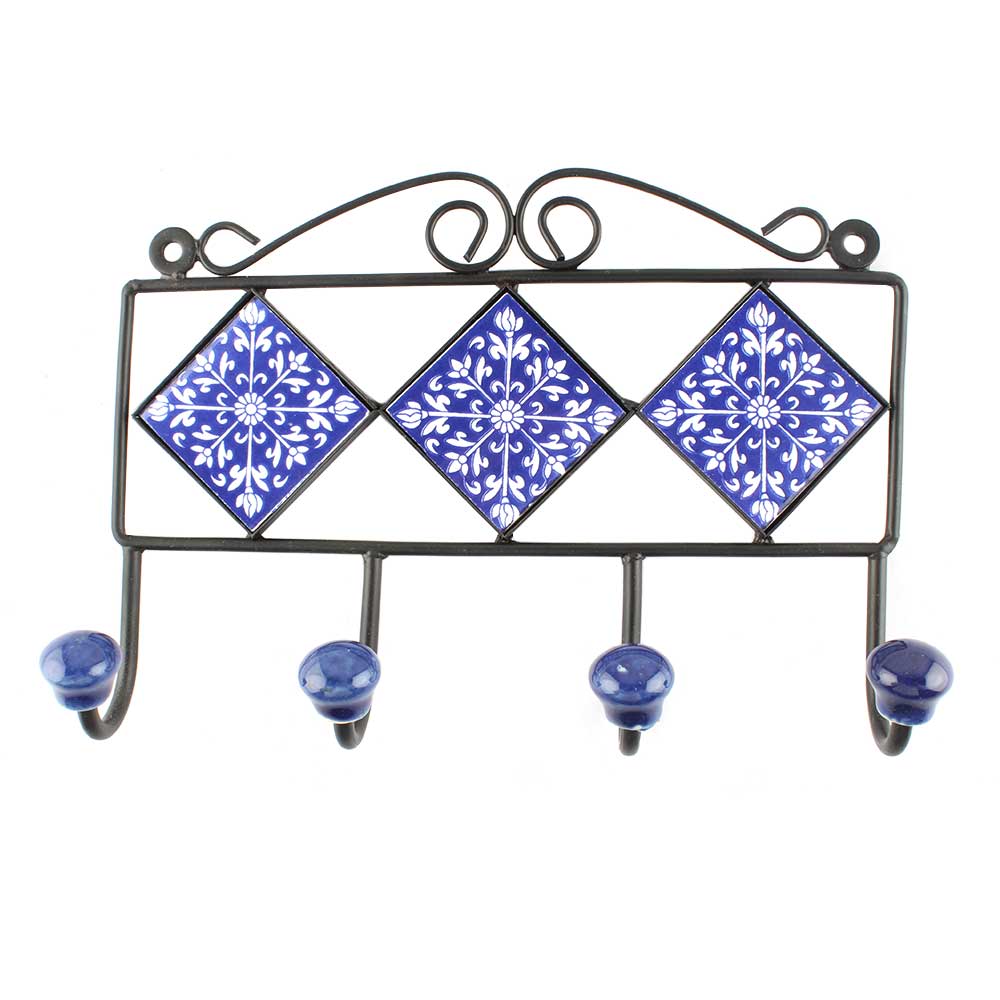 Navy Blue With White Leaf Ceramic Tiles Hook. When Put on Wall or Cabinet It is An Art in Itself. The Metal Part of this Hook is Black Powder Coated.