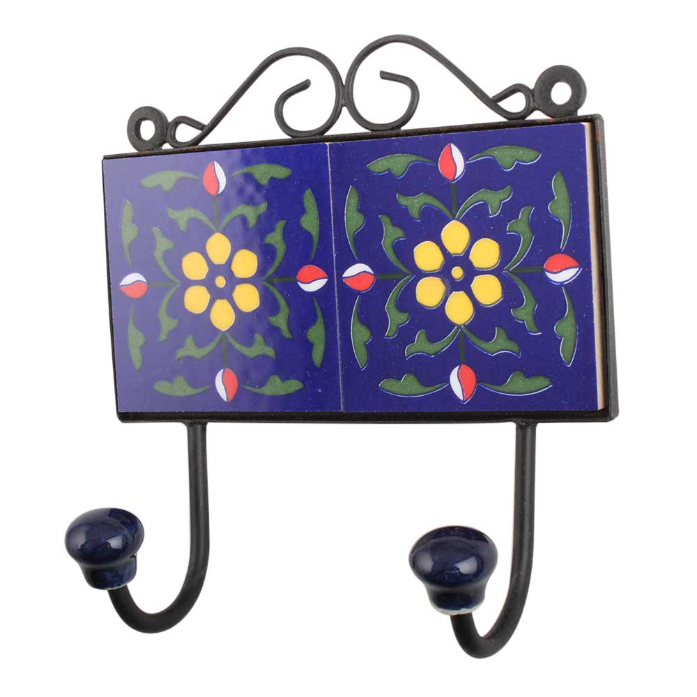 Navy Blue Yellow Floral Tiles Hook. When Put on Wall or Cabinet It is An Art in Itself. the Metal Part of This Hook is Black Powder Coated.