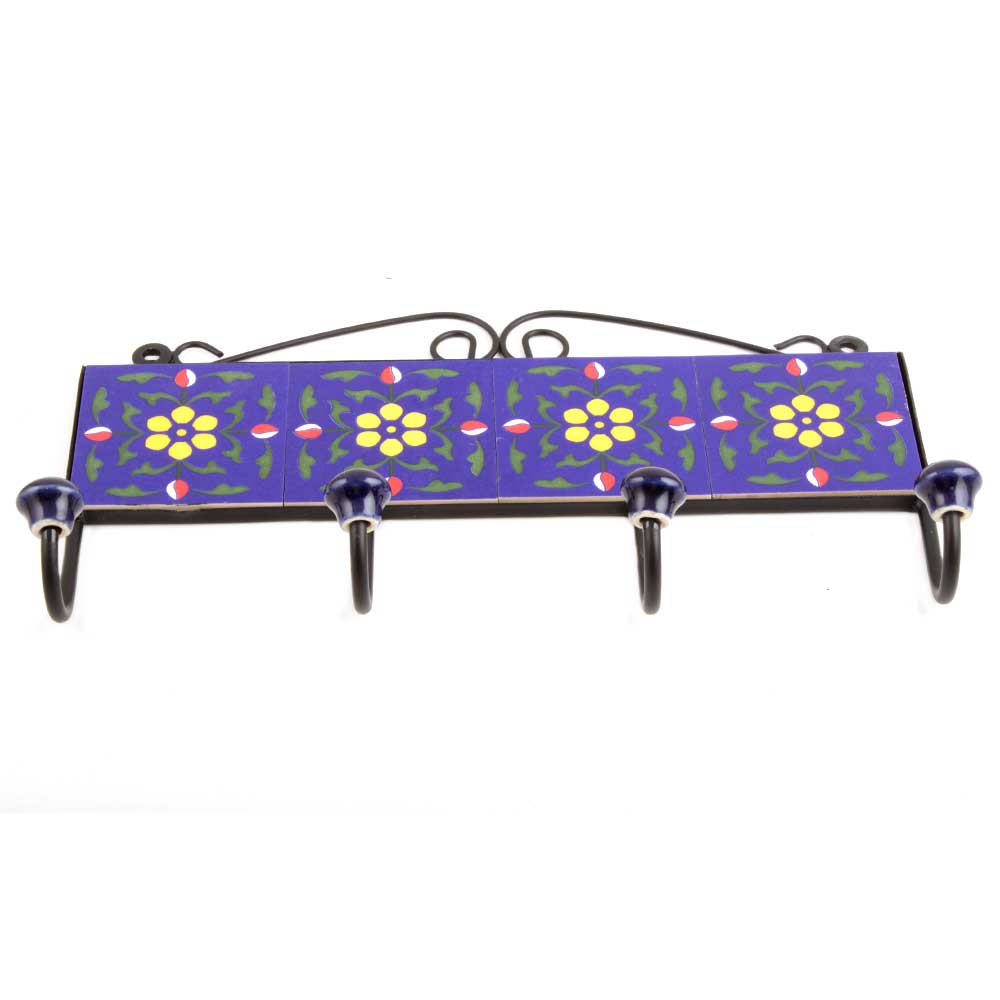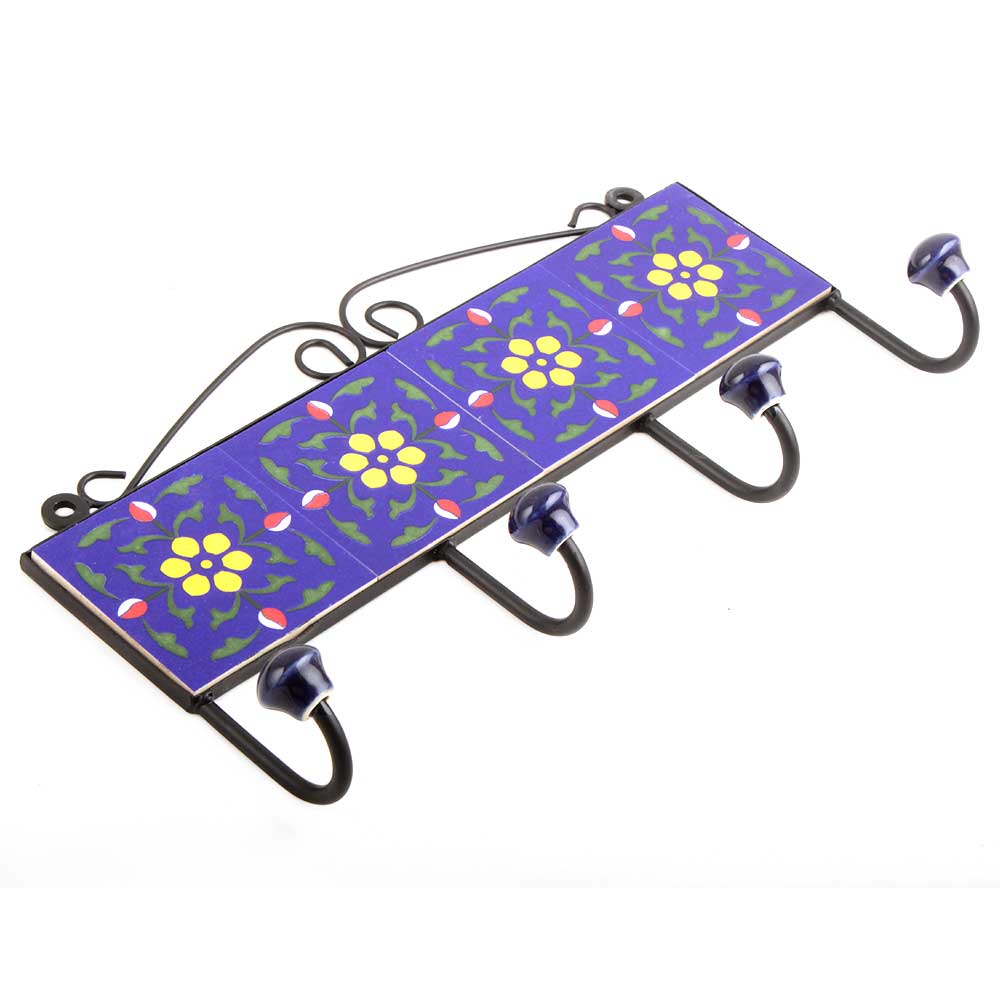 Navy Blue Yellow Floral Tiles Hooks .When put on wall or cabinet it is an art in itself. The metal part of this hook is black powder coated.