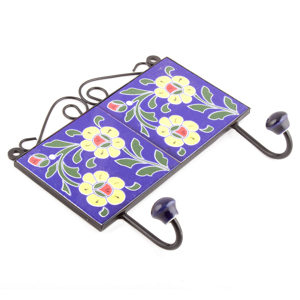 Navy Blue Yellow Flower Tiles Hooks. When Put on Wall or Cabinet it is an Art in itself. The Metal Part of this Hook is Black Powder Coated.