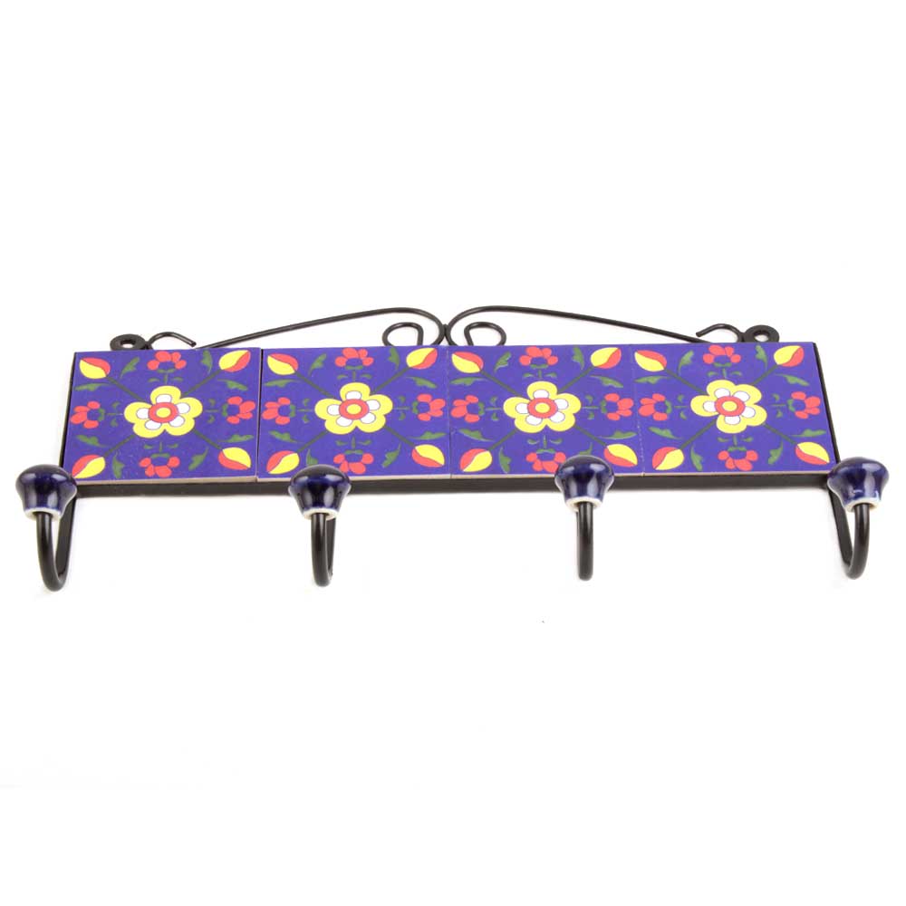 Navy Blue Yellow Tiny Flower Tiles Hooks .When put on wall or cabinet it is an art in itself. The metal part of this hook is black powder coated.