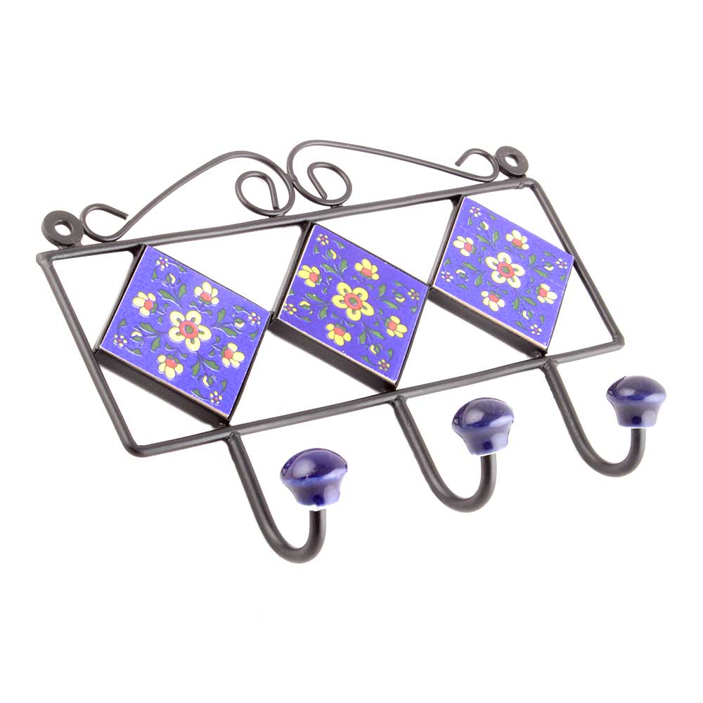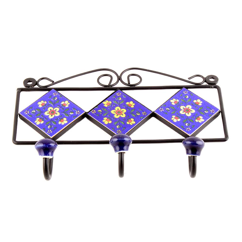 Navy Blue Yellow Tiny Flower Tiles Hooks. When Put on Wall or Cabinet it is an Art in itself. The Metal Part of this Hook is Black Powder Coated.