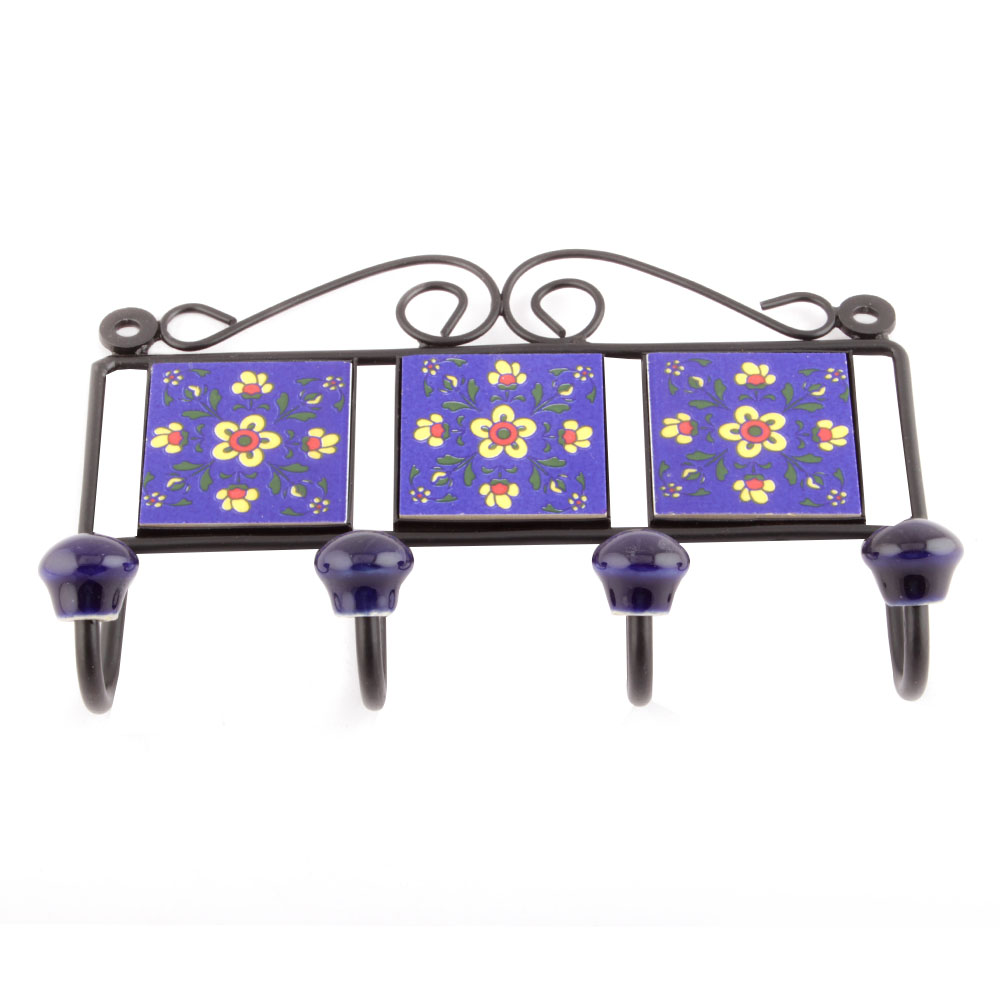 Navy Blue Yellow Tiny Flower Tiles Hooks. When Put on Wall or Cabinet it is an Art in itself. The Metal Part of this Hook is Black Powder Coated.