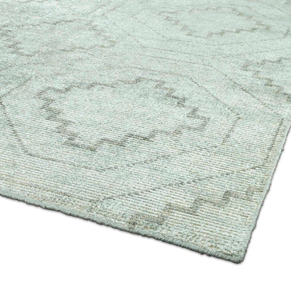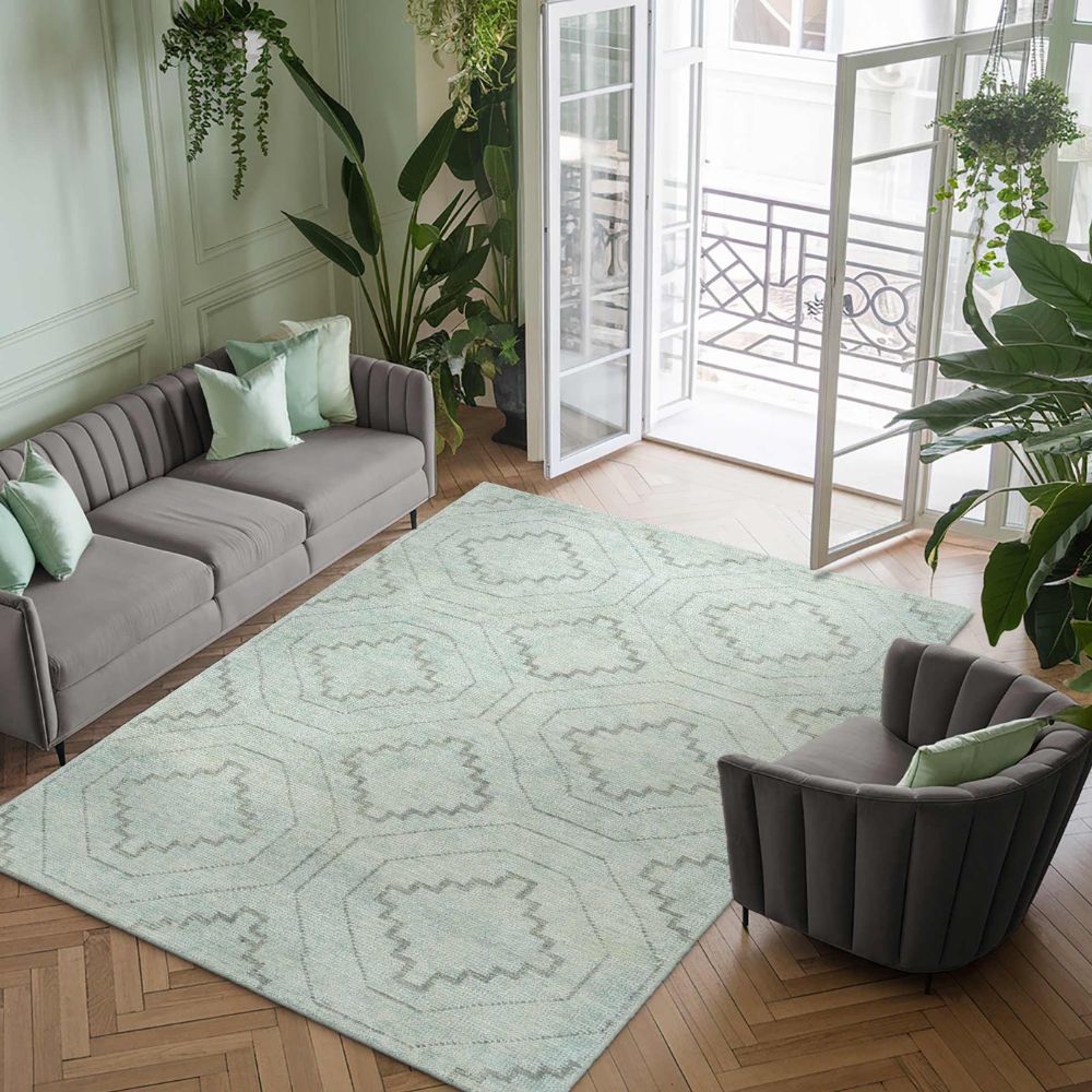 Material: Bamboo, Cotton. Color: Soft grey-green (as seen in image). Dimensions: 60.96 × 91.44 cm (36 inch base size). Weight: 6 kg. Other sizes available. Origin: Bhadohi, India – renowned rug weaving hub.
