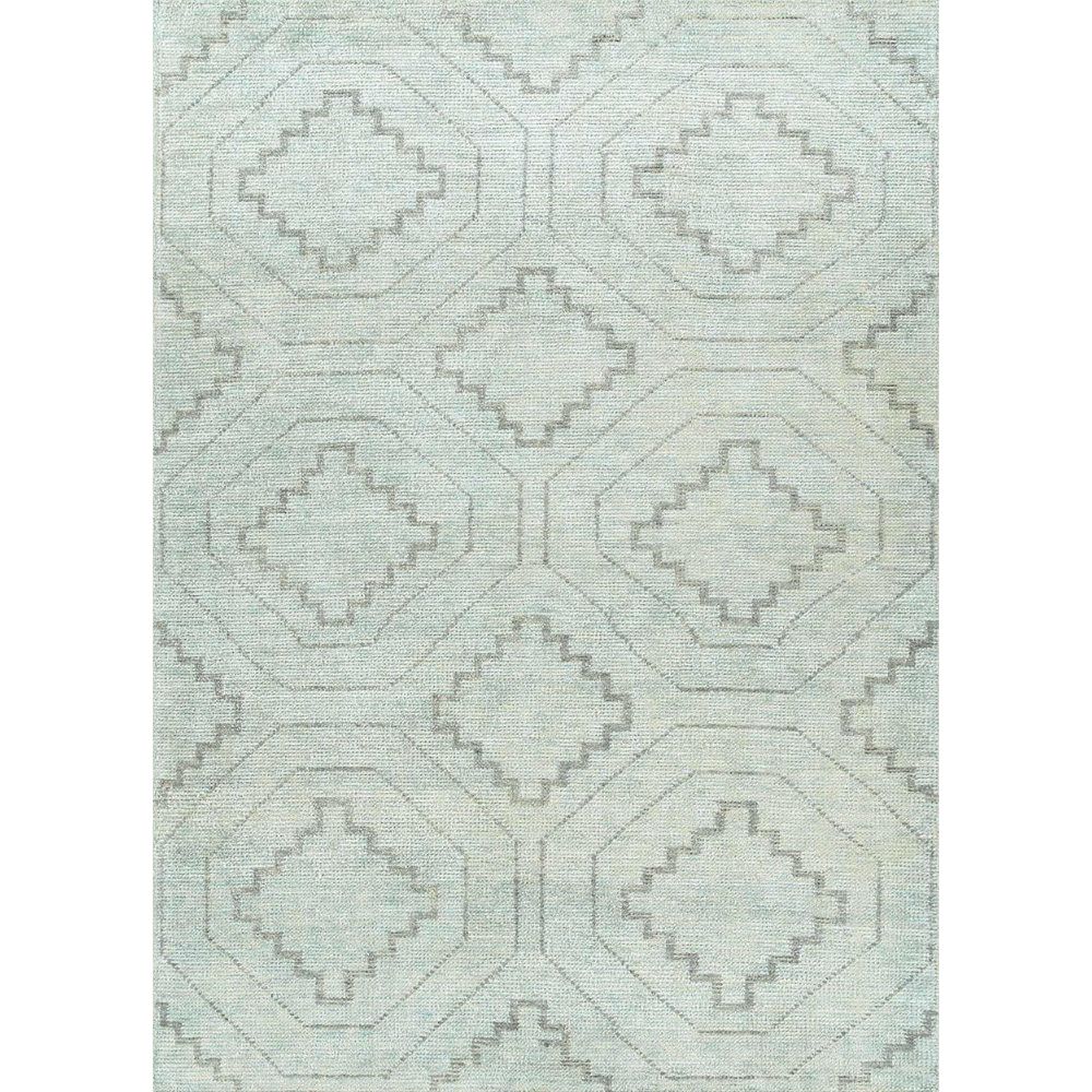The rug combines geometric symmetry with a soft neutral palette, making it versatile for both modern and traditional décor.