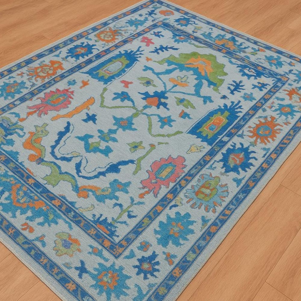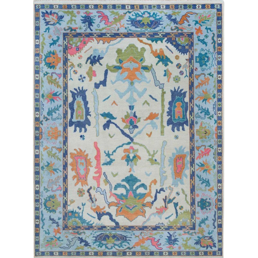 The rug features a soft ivory base with vibrant blue, green, orange, and pink detailing.