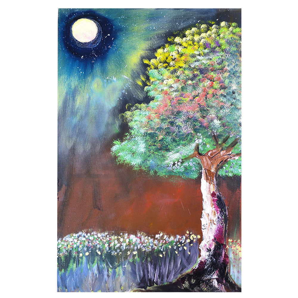 Bathe your walls in dream-soaked color with this evocative moonlit landscape. A full, radiant moon crowns the canvas, its halo dissolving into deep sapphire and emerald washes that suggest an endless night sky. Below, a single ancient tree stands sentinel, its textured trunk painted with expressive impasto strokes of ochre, umber, and flashes of magenta. The canopy dazzles with layered dabs of lime, citrus yellow, coral, and lavender, evoking spring blossoms caught in silver moon-beams. At the base of the composition, a whispering meadow of delicate white wildflowers sways against velvety indigo grasses, softening the transition to the warm earthen reds of the background. The artist balances bold abstraction with recognisable forms, inviting viewers to wander between reality and reverie. This piece infuses any modern living space with serenity, wonder, and the quiet reminder that even in darkness, nature blooms with luminous possibility. Hang it where imagination greets you nightly.