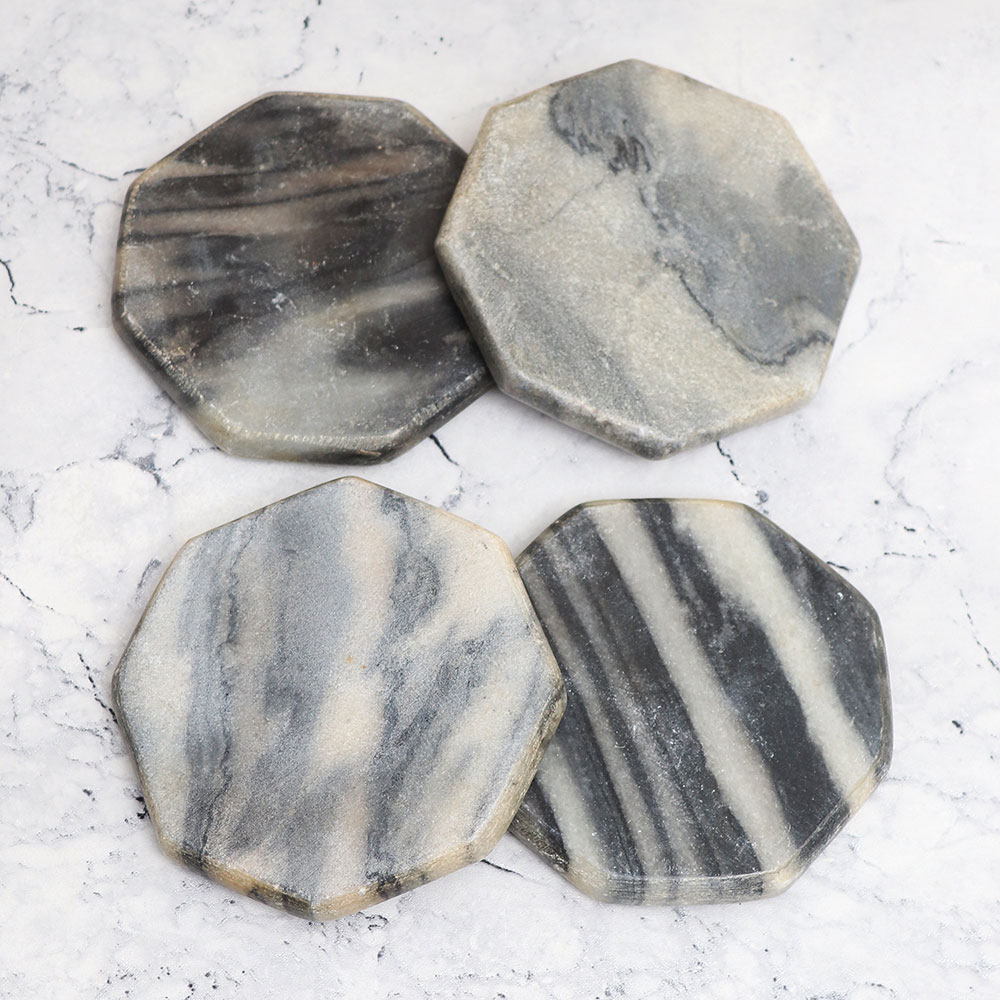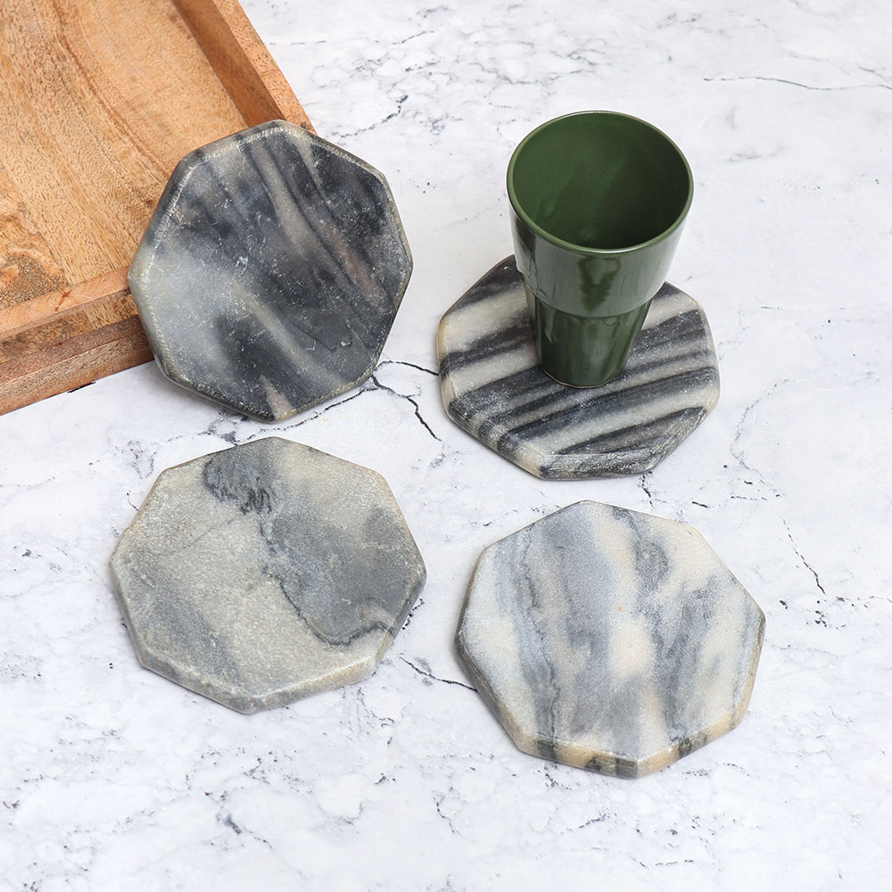 Our Marble Tea Coaster Set is handcrafted from high-quality wood by highly skilled Indian craftsmen. This Pack of 4 coasters features a unique octagon shape, adding an element of elegance and sophistication to any setting. Each coaster is handmade, ensuring attention to detail and superior craftsmanship. The Marble Tea Coaster Set comes in a charming antique finish, combining white and grey colours that effortlessly complement any decor style. Beyond its aesthetic appeal, these coasters serve a practical purpose. They are designed to hold water, tea, juice, or coffee glasses, safeguarding your surfaces from unsightly stains. Whether it\'s at home, in the office, a restaurant, hotel, or cafe, these coasters prove to be a functional and stylish addition. Furthermore, this coaster set makes for an exceptional gift for your family, friends or relatives on special or festive occasions. Its timeless design and impeccable quality make it a perfect choice to impress and delight.