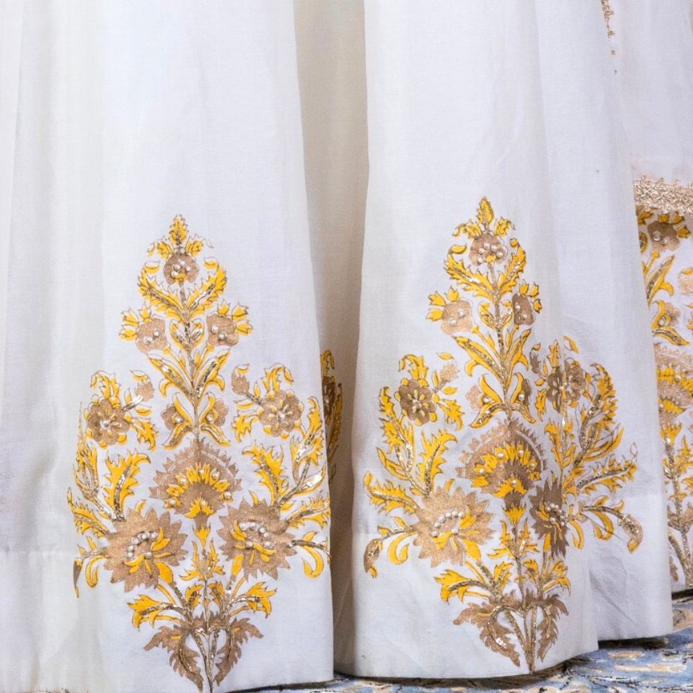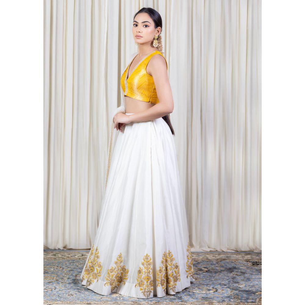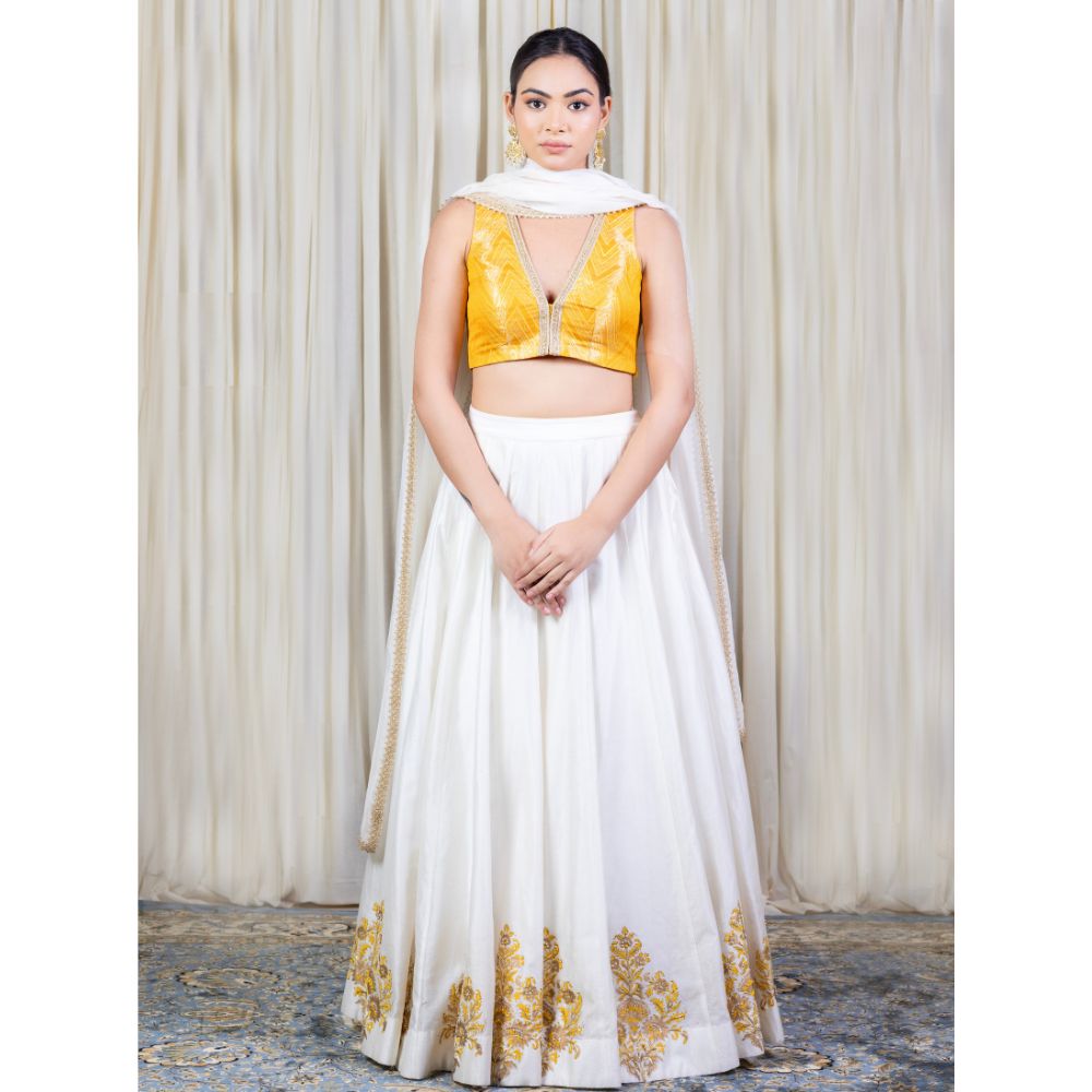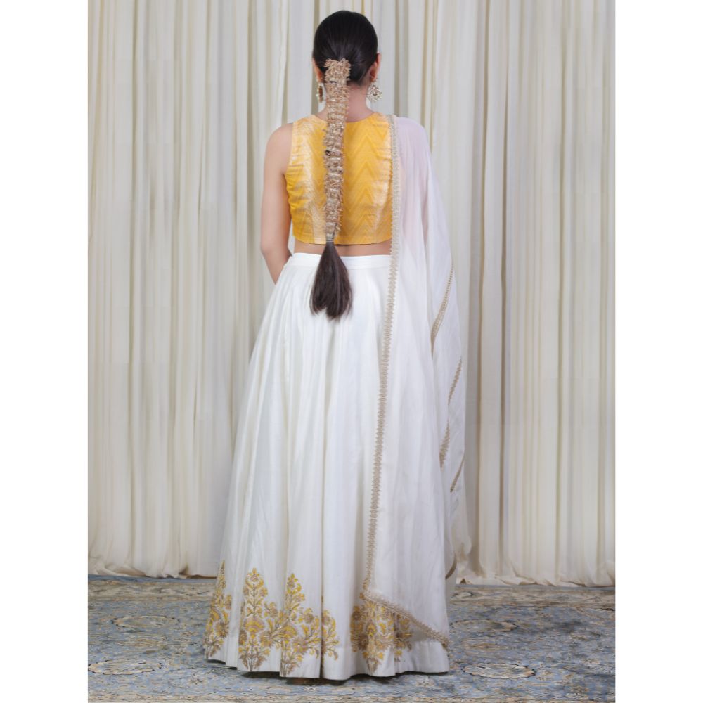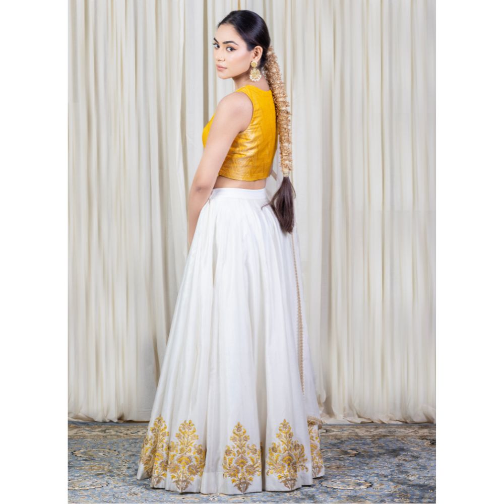 Make an ethereal statement with this Off-White Lehenga Set with Hand Embroidery, a blend of refined elegance and traditional charm. Crafted from luxurious pure cotton Chanderi, the flared lehenga features intricate hand block printed motifs along the hem, highlighted with delicate golden embroidery that adds regal sophistication. The rich texture and lightweight nature of the fabric ensure ease of movement and all-day comfort. Paired with a vibrant mustard yellow brocade blouse, this ensemble creates a striking contrast — perfect for haldi, mehendi, or festive occasions. The sleeveless blouse offers a modern silhouette while preserving traditional richness with its woven zari detailing. A sheer viscose organza dupatta completes the look, adding grace and dimension with its embroidered edges. Whether worn at a wedding celebration or styled for a festive soirée, this handcrafted lehenga set celebrates Indian artistry with timeless beauty. Pair with traditional jewelry to complete your royal ethnic look.