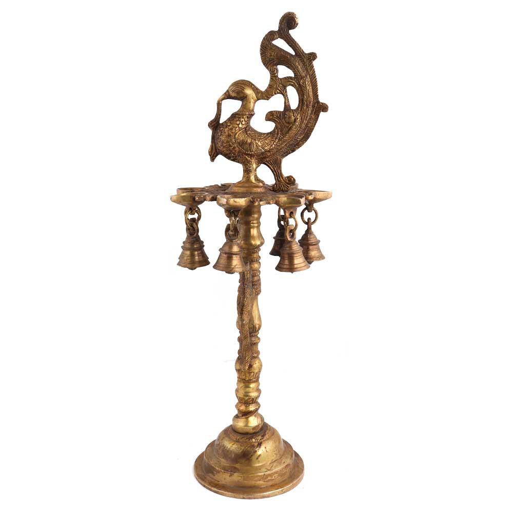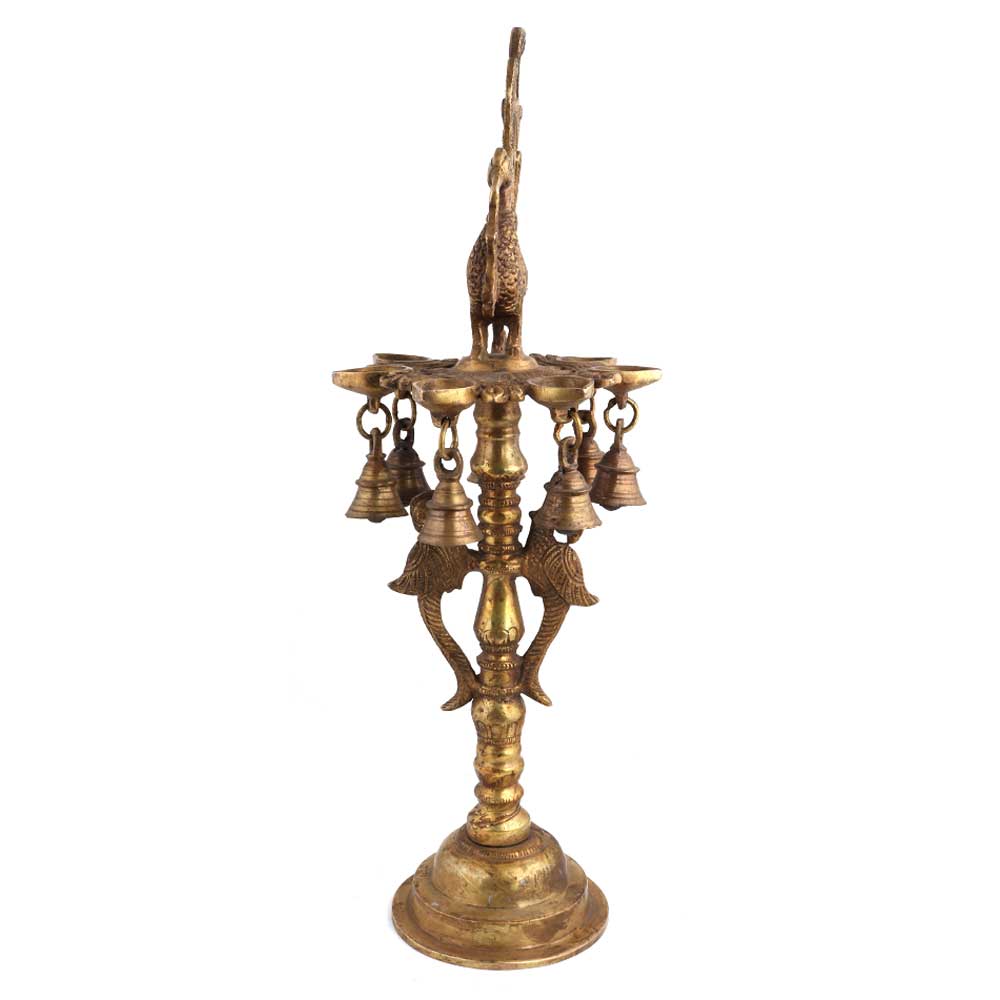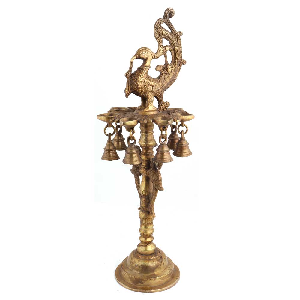 Handcrafted Festive decoration brass peacock with many diyas, bells and dancing figurines hanging at the bottom is made by the master craftsmen of India in a traditional way . Diwali gift and decoration, wedding , stage , temple decoration.