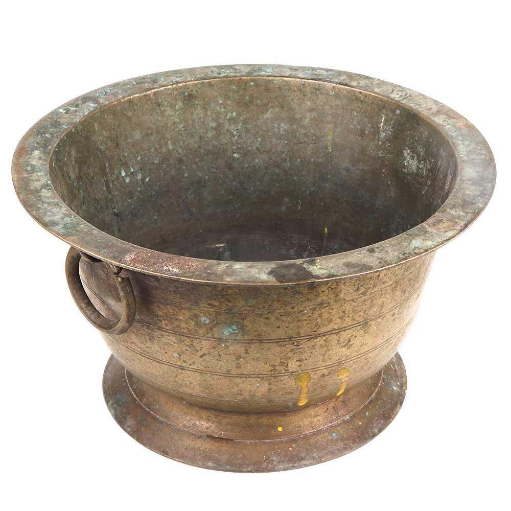 Old brass flower pot with one single ring handle for hanging plants and planters for your porch, patio and balcony. Use t as a planter pot, flower decoration, as incense burner, table decoration or food decoration.