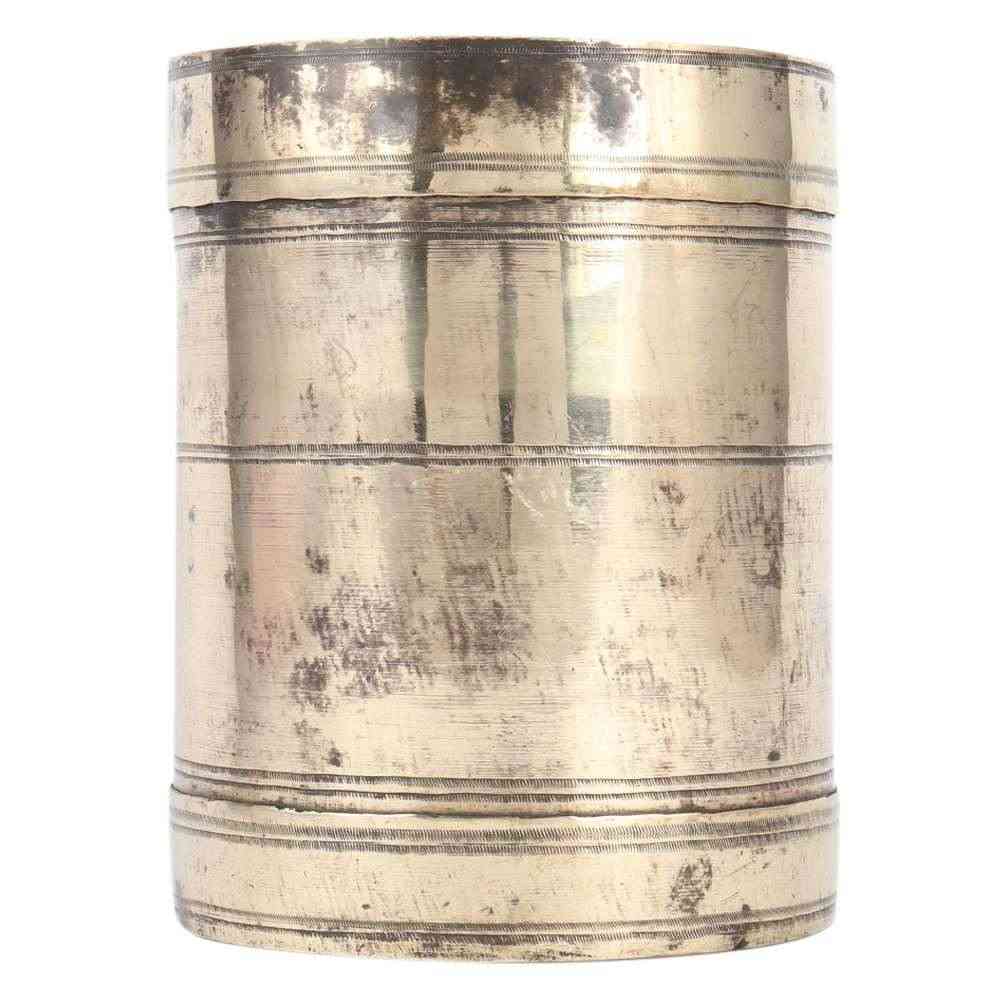 This antique Indian weight scale or measuring pot is made of brass and embellished with traditional crafts. It's a piece of abstract art that will get people talking. This Indian weight scale can be used as a paperweight or as a decorative item in your office.