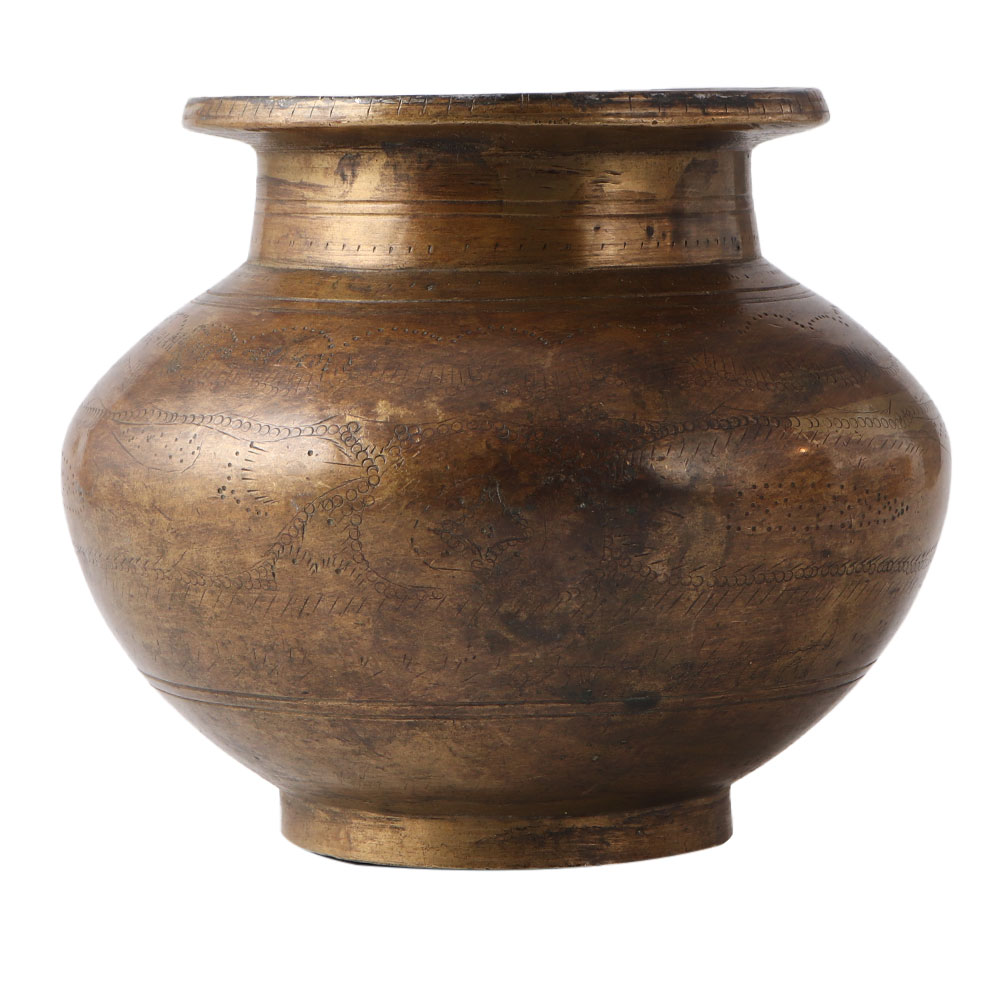 This hand-made brash Kalash is a pot, pitcher, or urn that is typically formed of earthy material or a metal (brass, copper, gold, etc.). It is utilised for performing rituals during any fortunate occasion. It is thought to have significant meaning in Vedic culture. Excellent present for anniversaries, weddings, and other happy events.