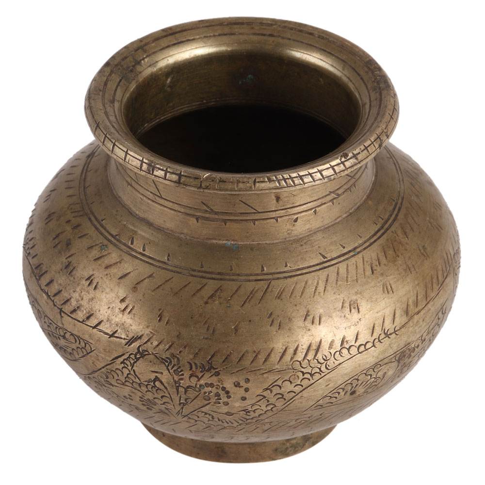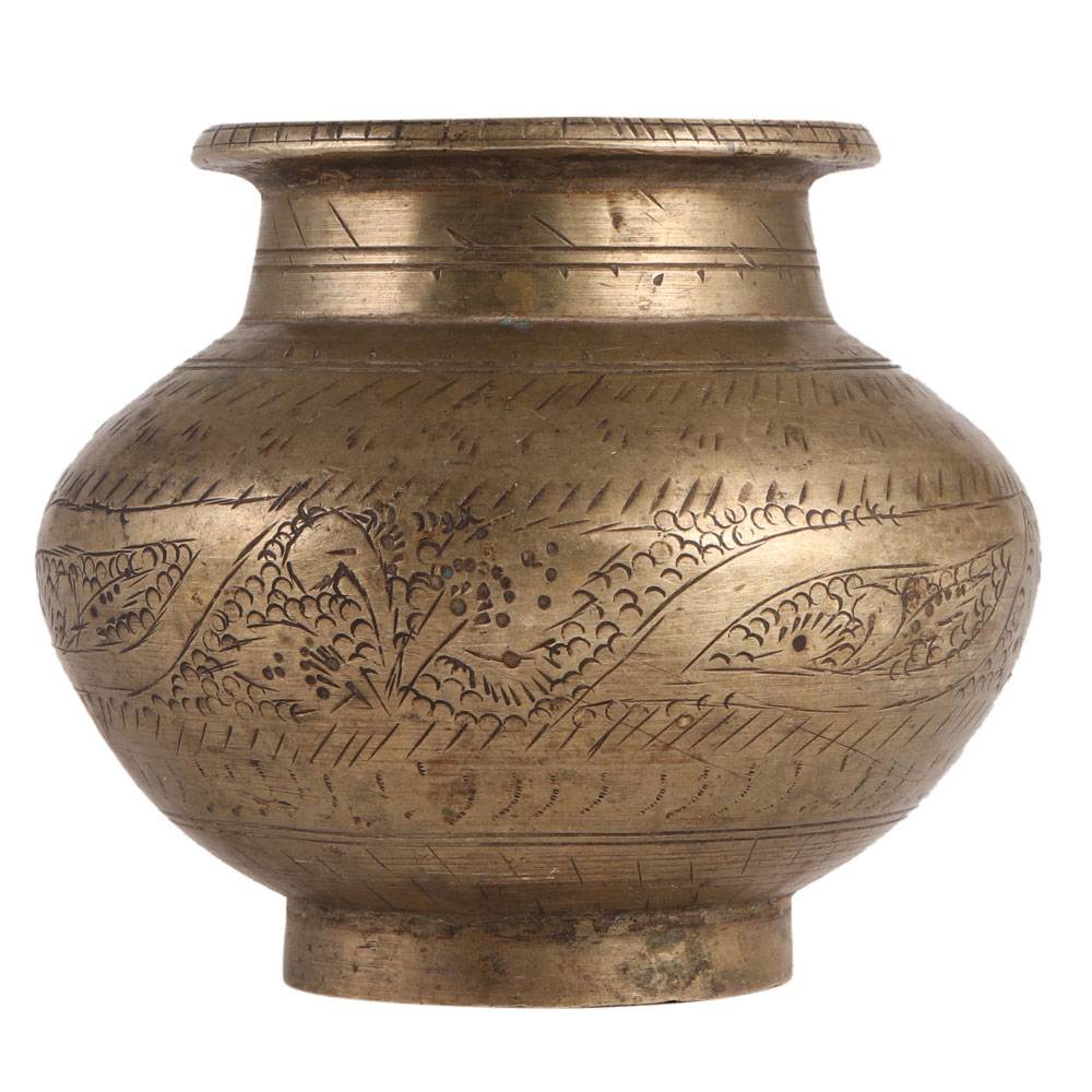 This old brass water pot is a perfect decorative item that is good for collection. This brass lota or pot has been intensely hand engraved with a lovely traditional pattern. It has a round shape with a solid base. A treat for vintage art lovers. A great piece to display. It comes in a dark finish.