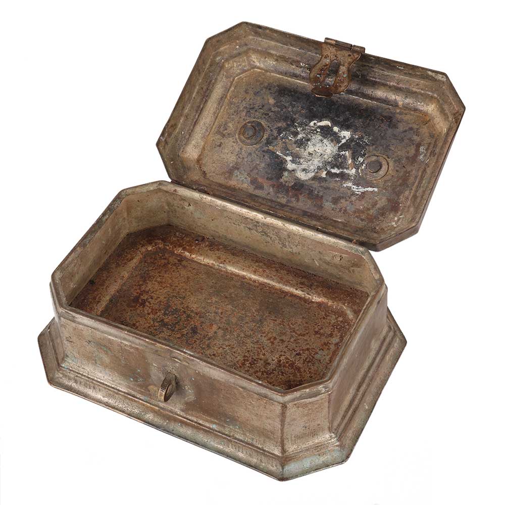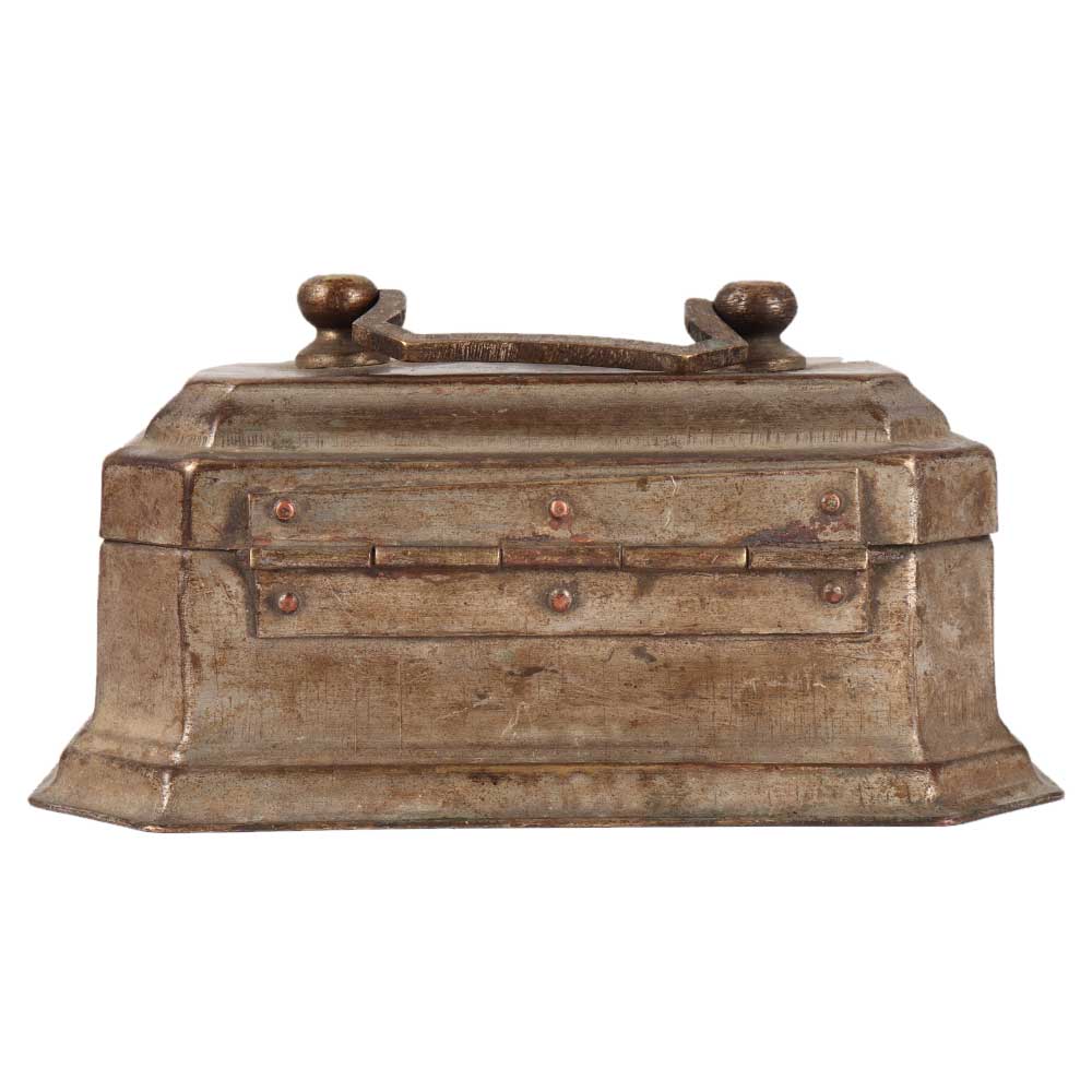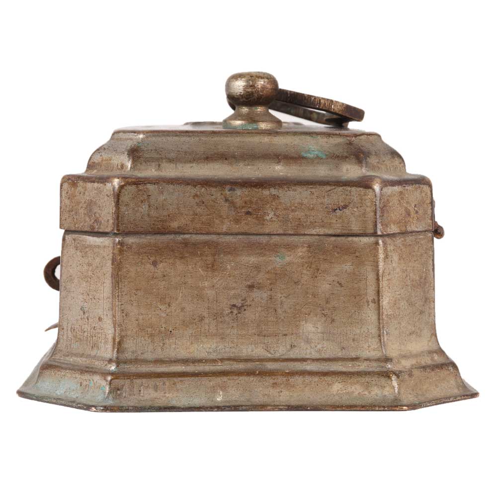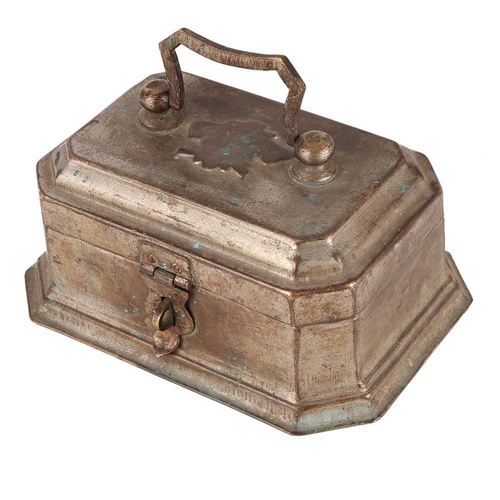 The handmade eight-sided brass box with top, clasp, and latch is great for home decoration. It's a great gift for weddings and other social events, and this is most commonly used as a jewellery box or treasure chest. It has an aged patina finish.