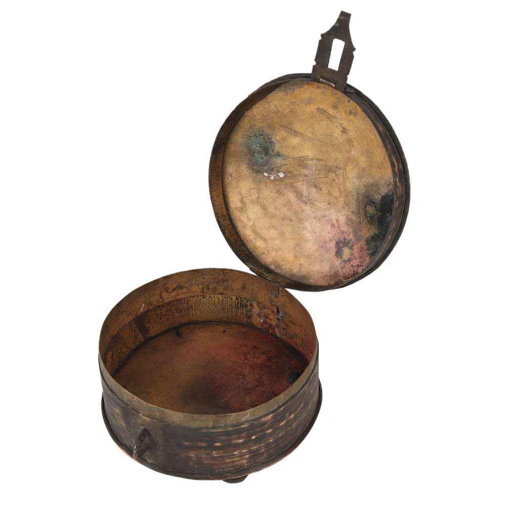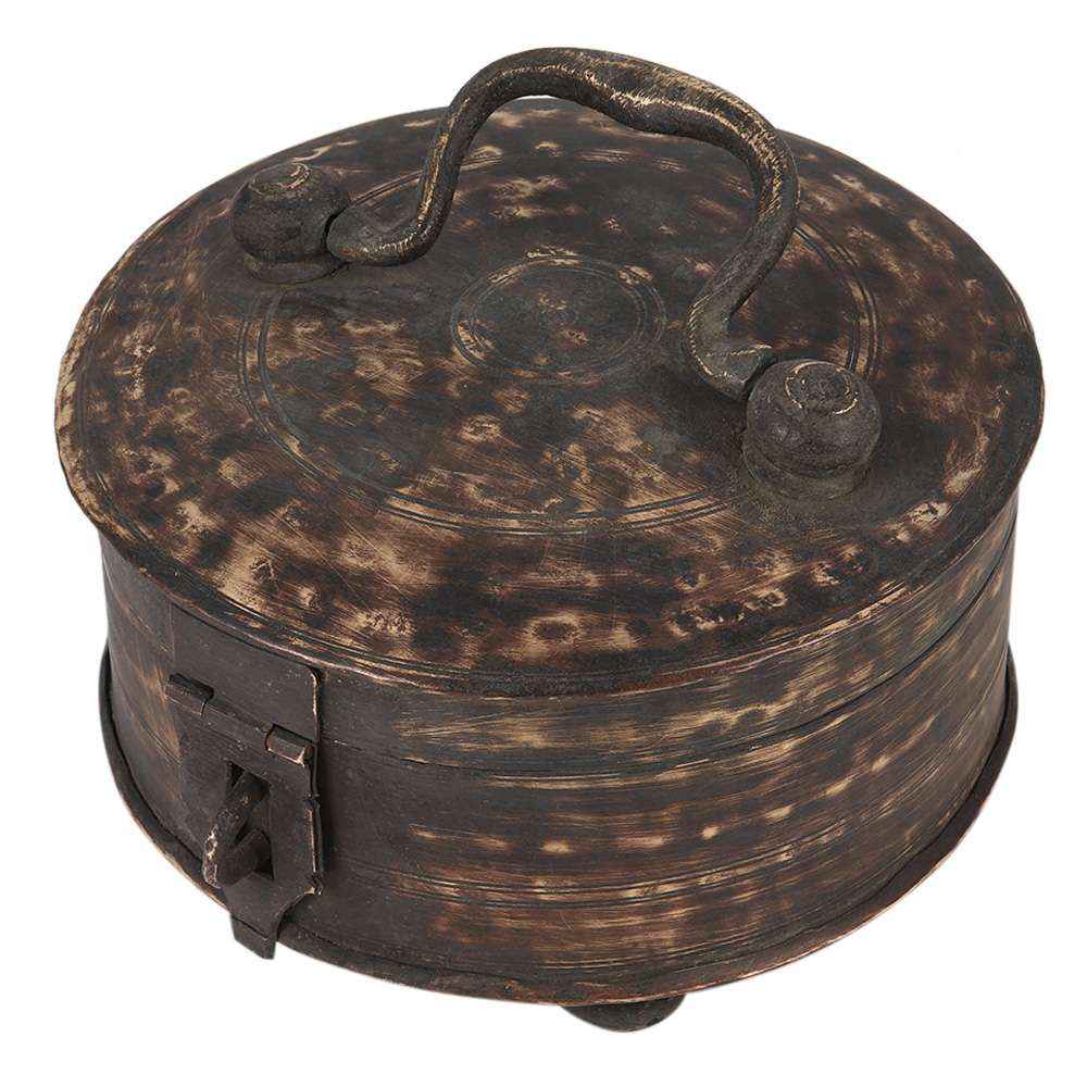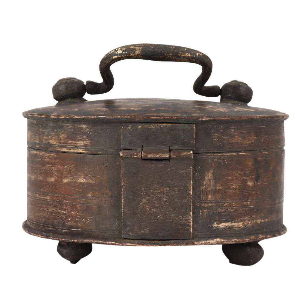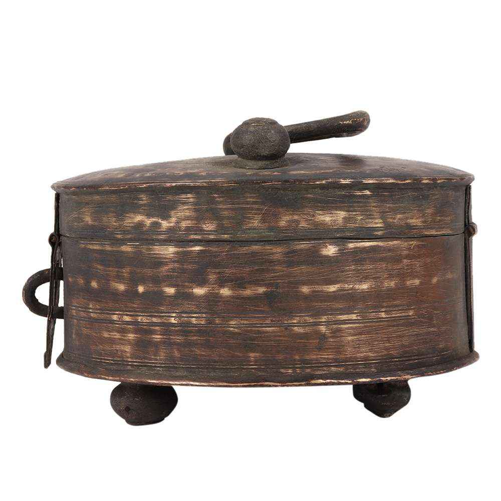 This is an old handcrafted brass ancient vintage utility box. This box is from the mid-1950s, and at the time, these types of boxes were used by wealthy families to keep their valuables safe. Most rich family women had vintage old brass boxes to keep their jewellery, diamonds, and stones safe. These boxes are also utilised in travel to protect valuable essentials, documents, and luxury items. With handles, this box is constructed in the Mughal style.