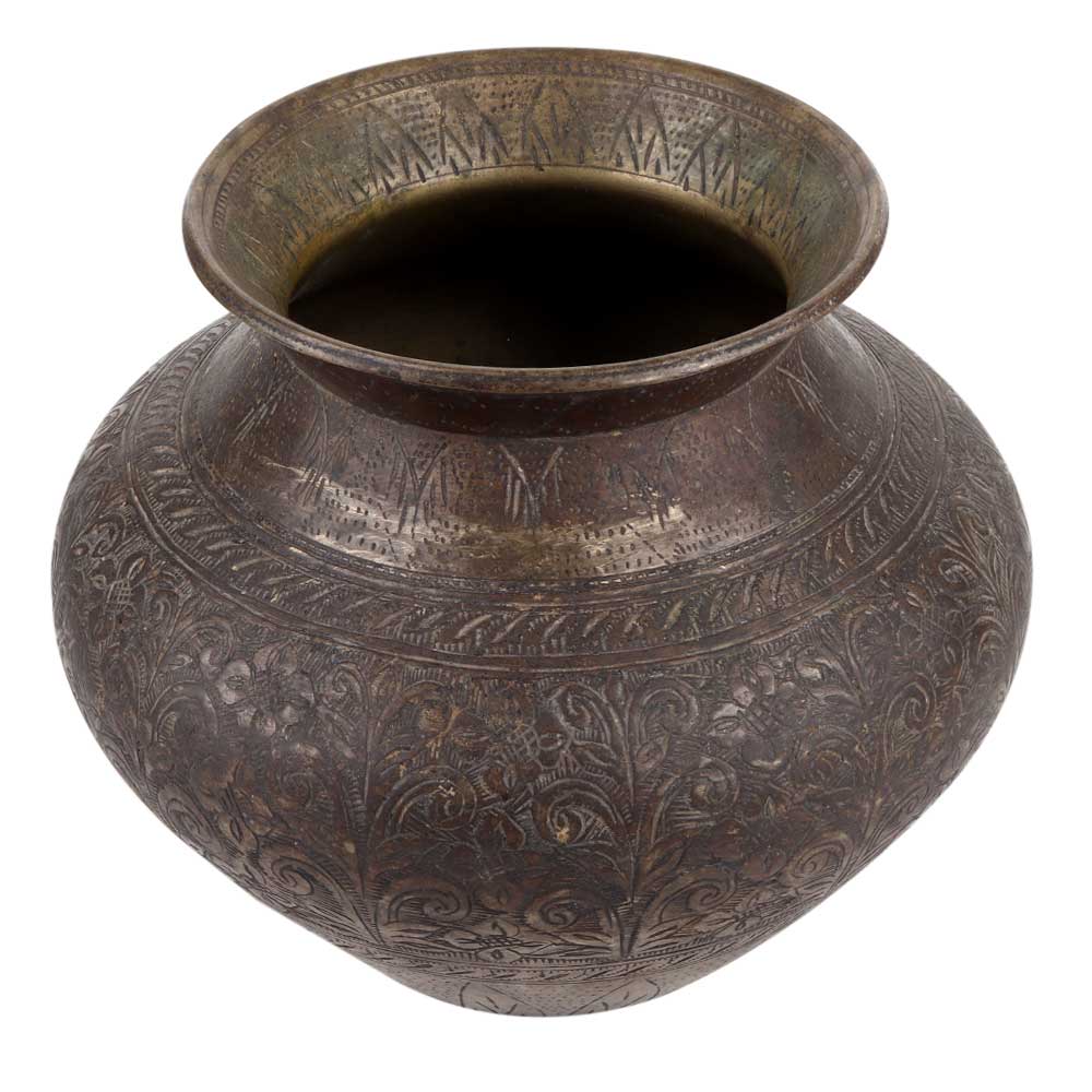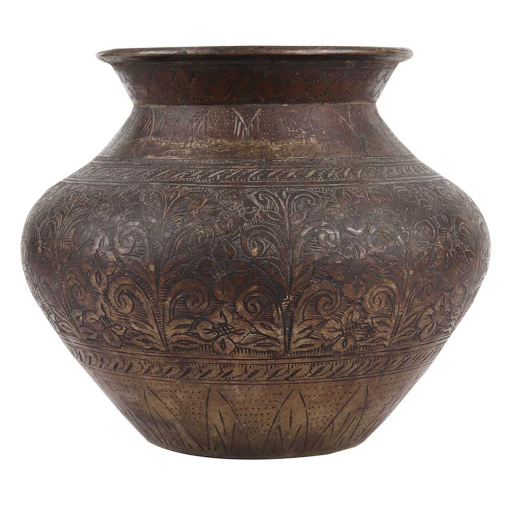 This brass pot is also known as kalash pot with lovely engraved pattern of leaves and flowers in the centre as well as the border . Use it place of worship. Temples in pooja room to store holy water or use it as kalash. Gift it to near and dear ones on diwali, new year or other auspicious functions and festivals. It comes with patina.
