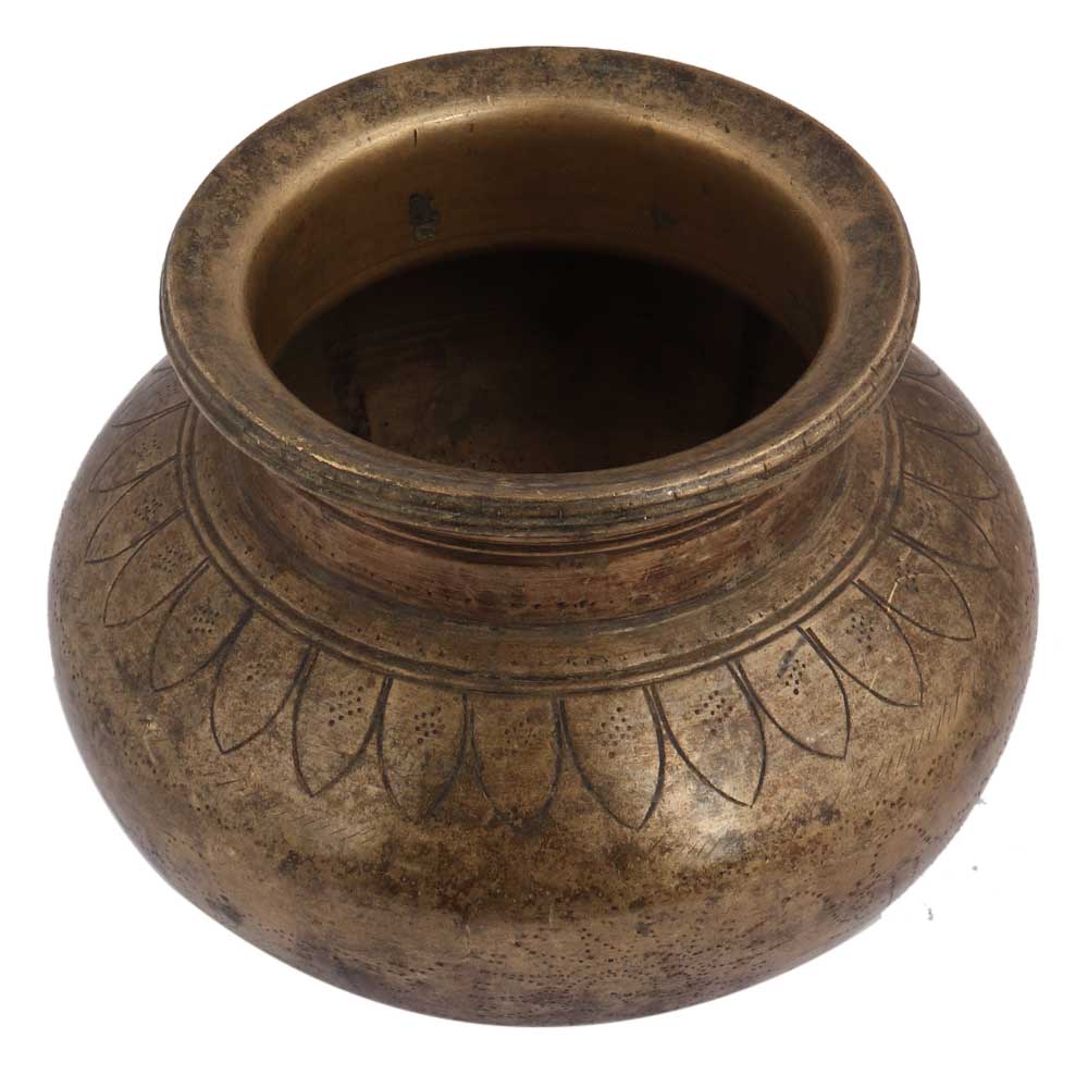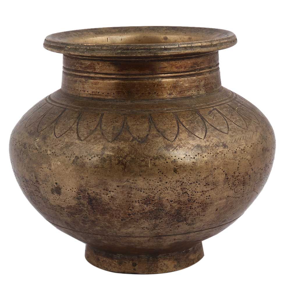Old Brass Pot With Faded Design Used For Worship .Place it in your interiors to beatify your idle corners, hotels, restaurant, low outlets, garden decoration or gift it your close to and pricey ones on Christmas, Diwali or other religious functions and occasions.
