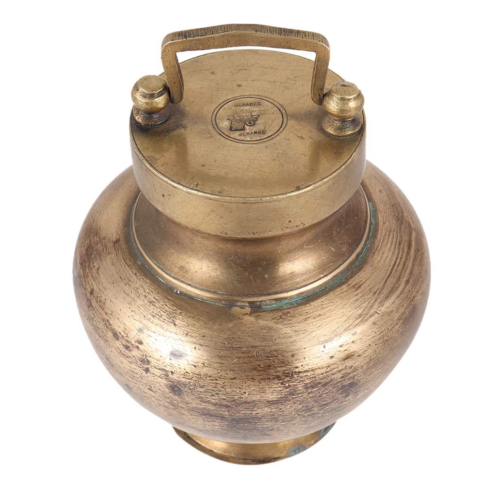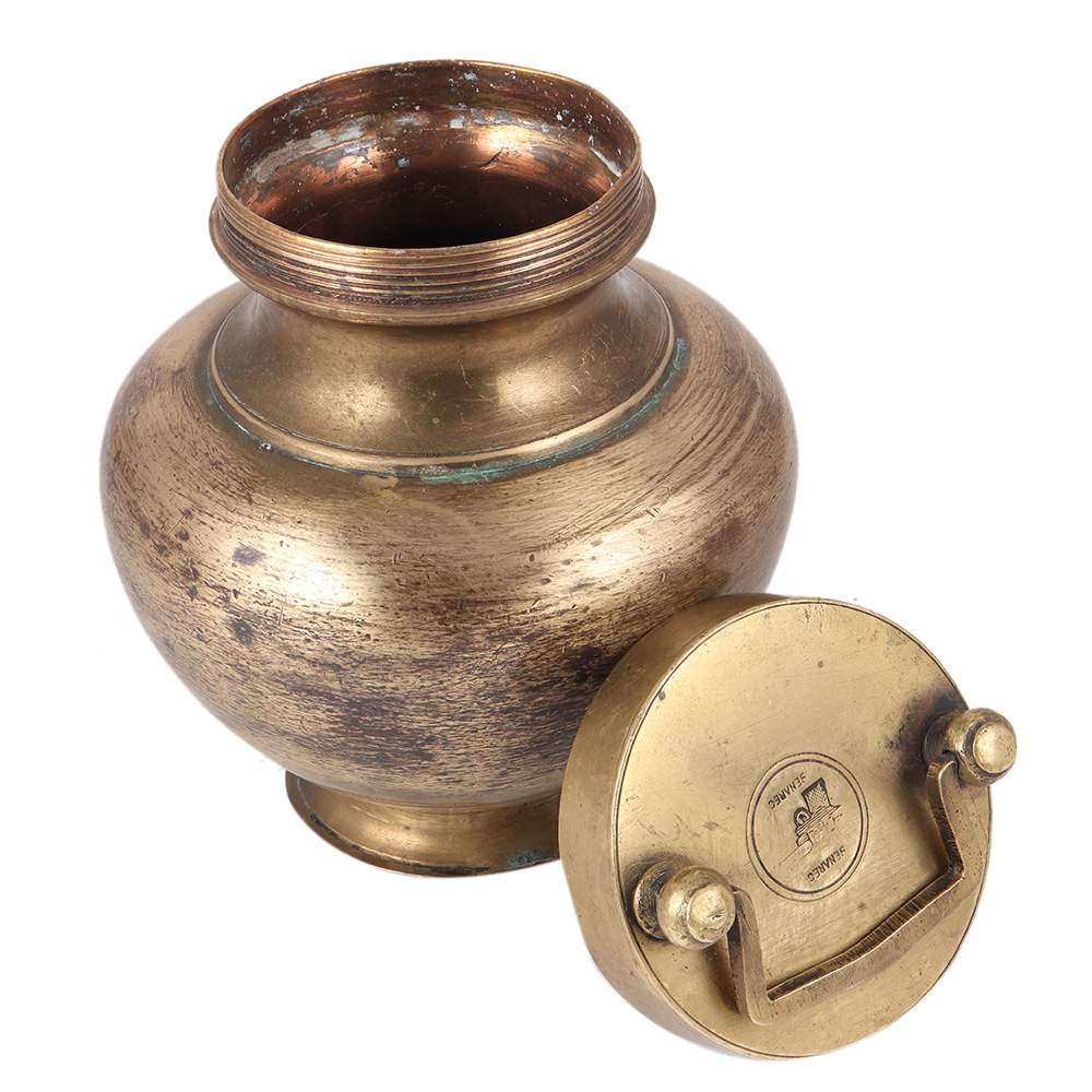It is a brass pooja, a milk container used by the Indian community to transport milk to the temple for religious and prayer activities. This Kamandal pot was initially used to store water for priests. Handmade in a lovely spherical shape with a beautiful natural finish. It was sold as water pots or Ganga Jamna, Jal, or Jamuna - vessels used to transport water from the sacred Ganges. It's well-made, with a tight-fitting screw-on cap.