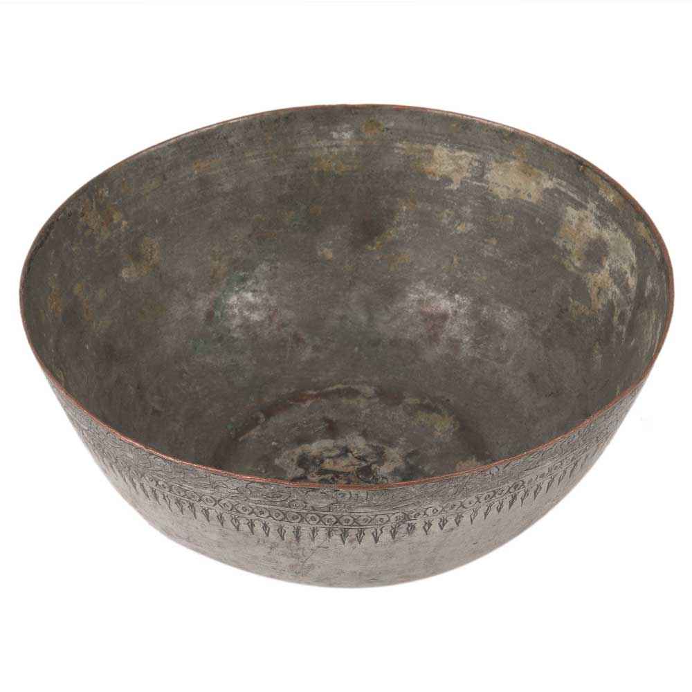 This antique brass-footed bowl is a work of traditional arts local artists. This footed bowl's stem and foot are carved and have a beaded border. Its ancient look makes it a great gift or piece of home décor.