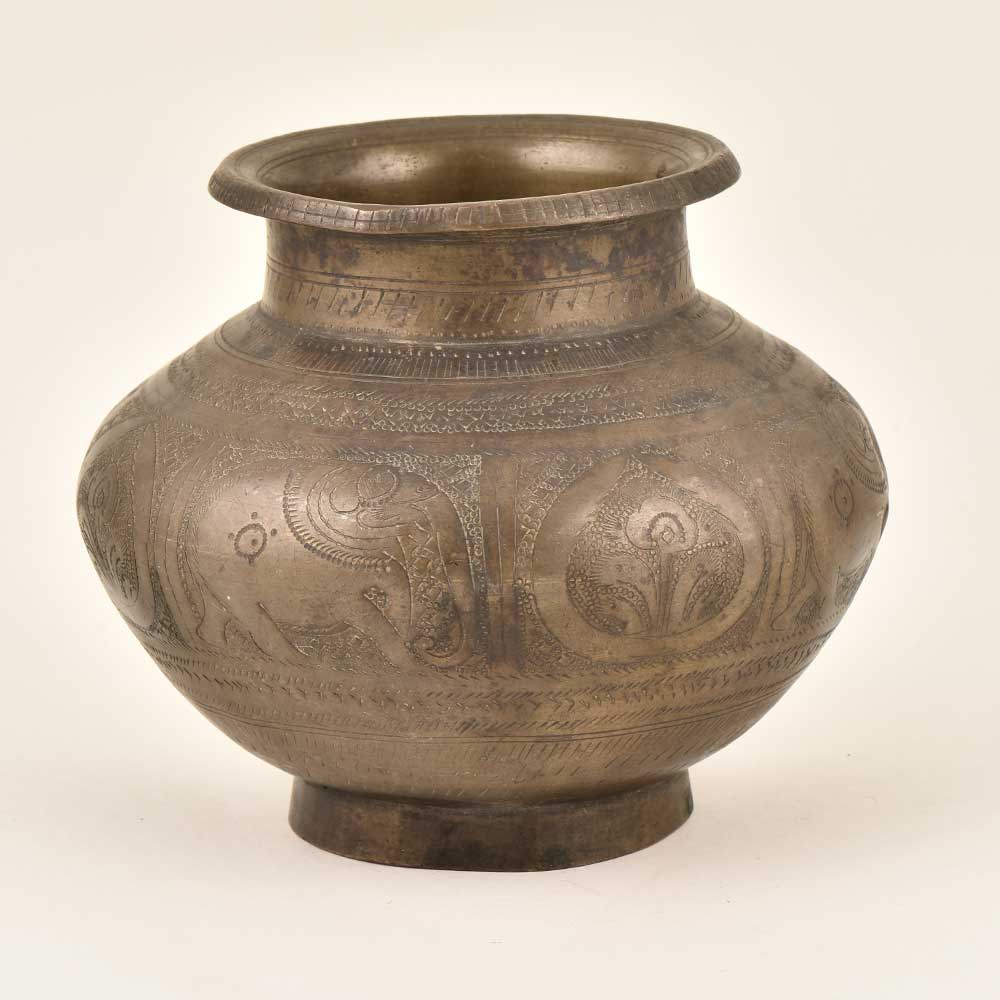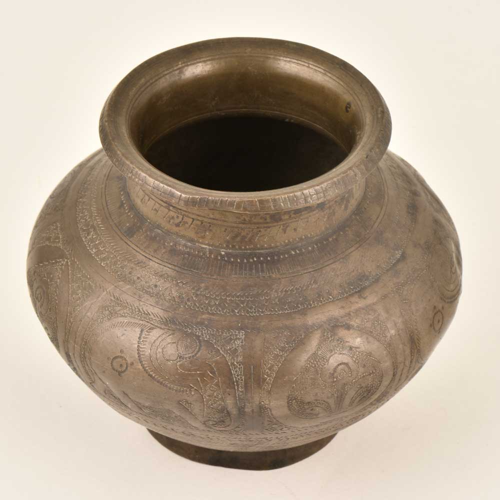 Small pot with fine engravings is made of brass by the skilled craftsmen of India. A Nice Looking Brass Pot Used Originally for Drinking Water. Hand Crafted and Engraved. Good Condition and a Rich Patina. This beautiful pot can be used for gifting, home decoration etc.