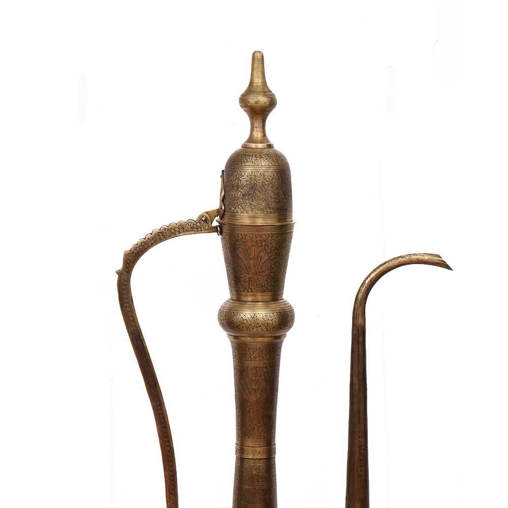 Old large brass ewer aftaba or pitcher with engraved floral design and movable lid, brass surahi, Indian flower pot, Persian décor. This classic ewer from India and Persia with significant Islamic characteristics has a very attractive slim and elegant shape that can become a focal point in your home decor.