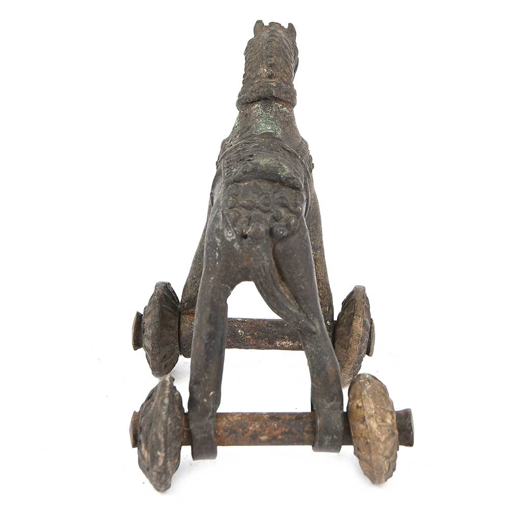 A Vintage Brass Temple Toy From India of a Horse on Wheels with a Head Crest. The Axels Appear Original but All Four Wheels Have a Different Design.