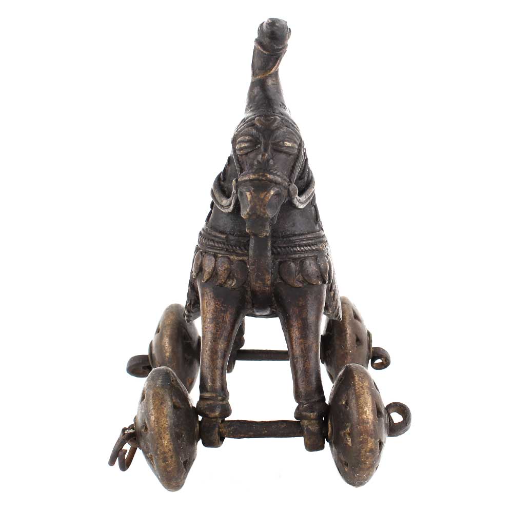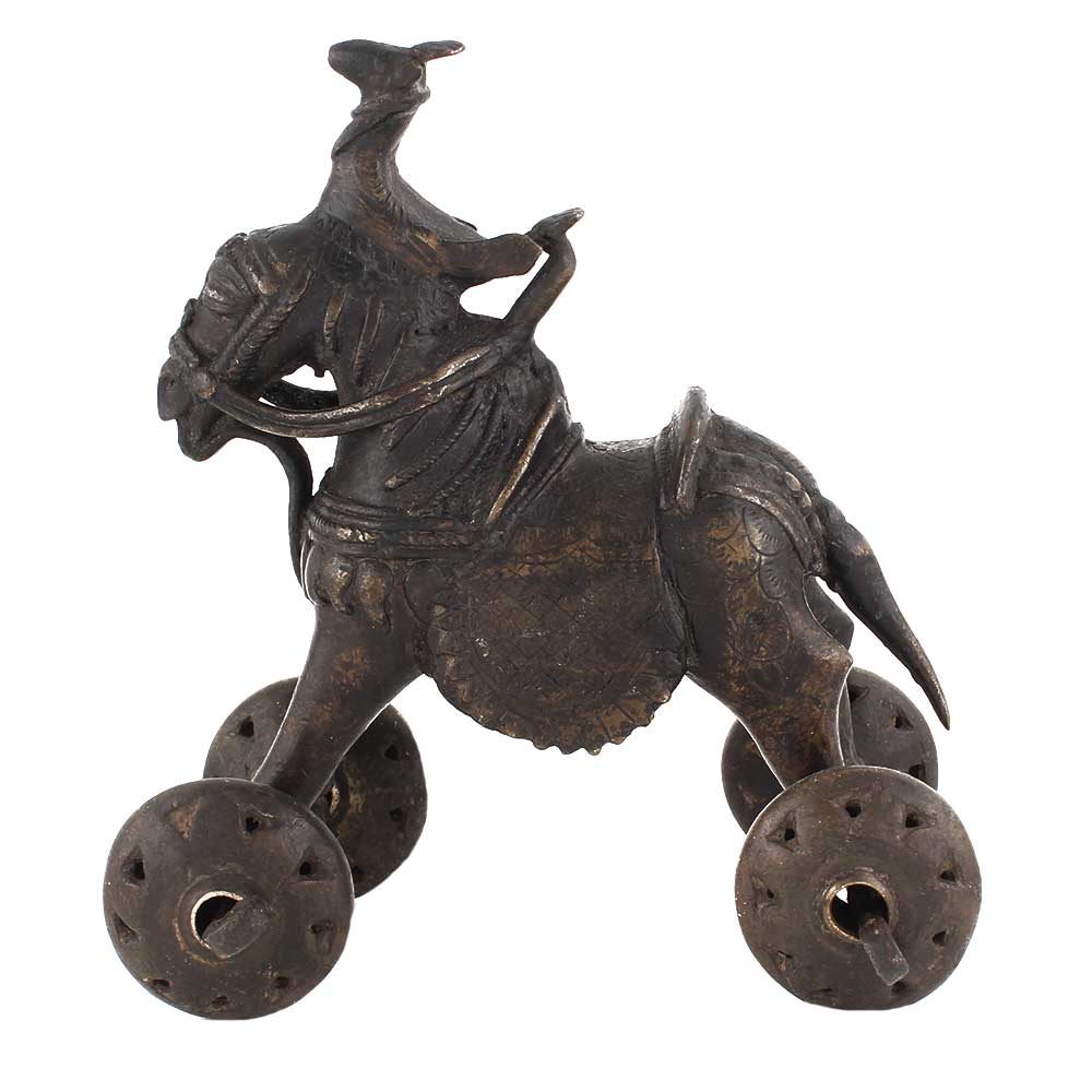 A historic figure of a horse on wheels with a bird statue perched on its head. The horse is decked up with trappings and a decorative saddle cloth that is held in place by ropes. It has a patina finish.