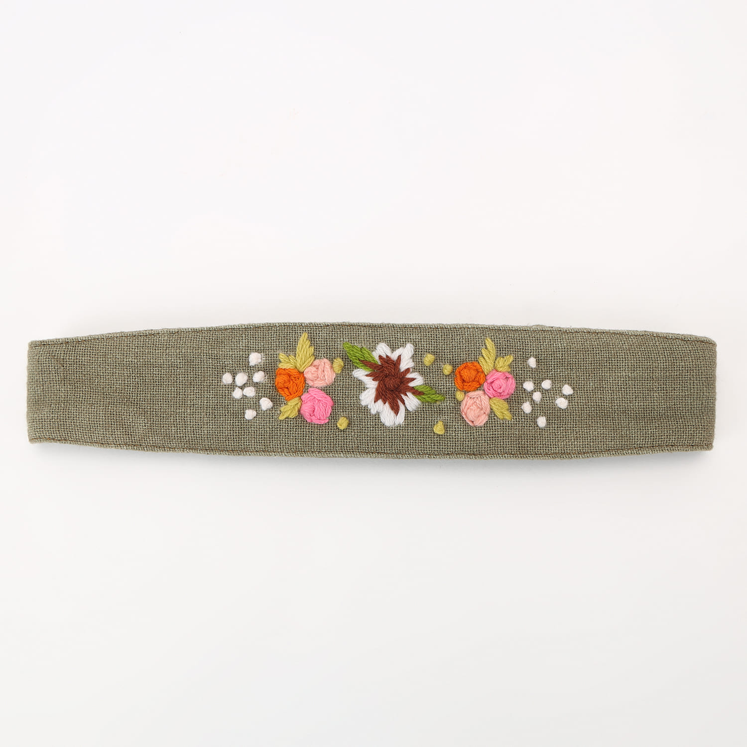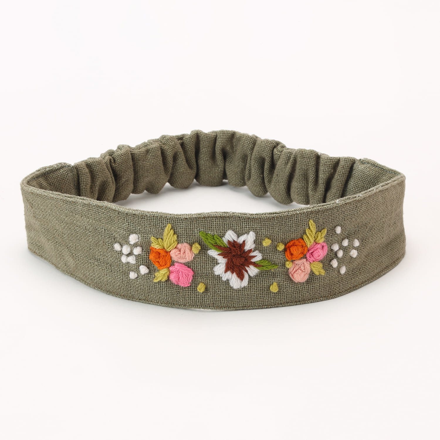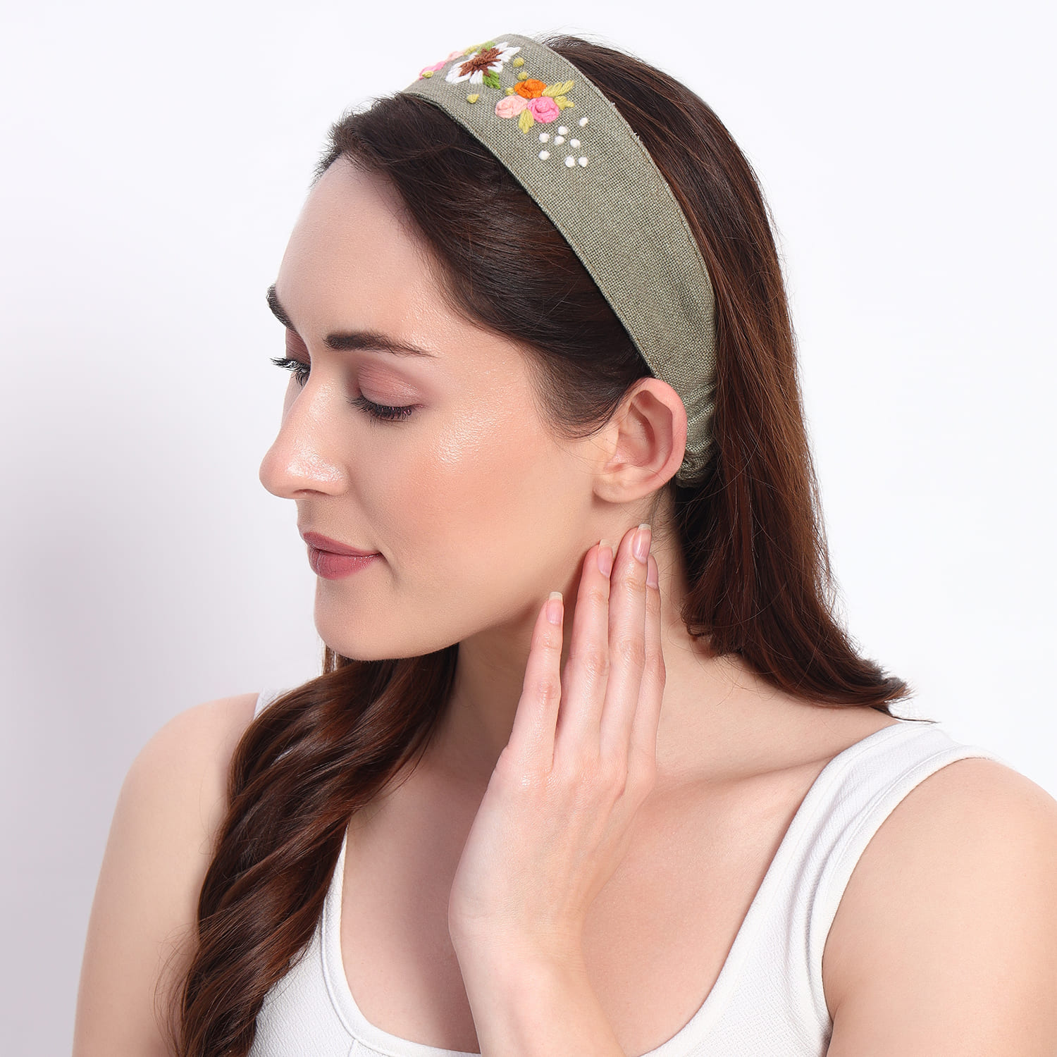 Pair the Olive Bloom Hairband with linen dresses, kurtas, or casual denim, and hand-wash gently to maintain fabric softness and color.
