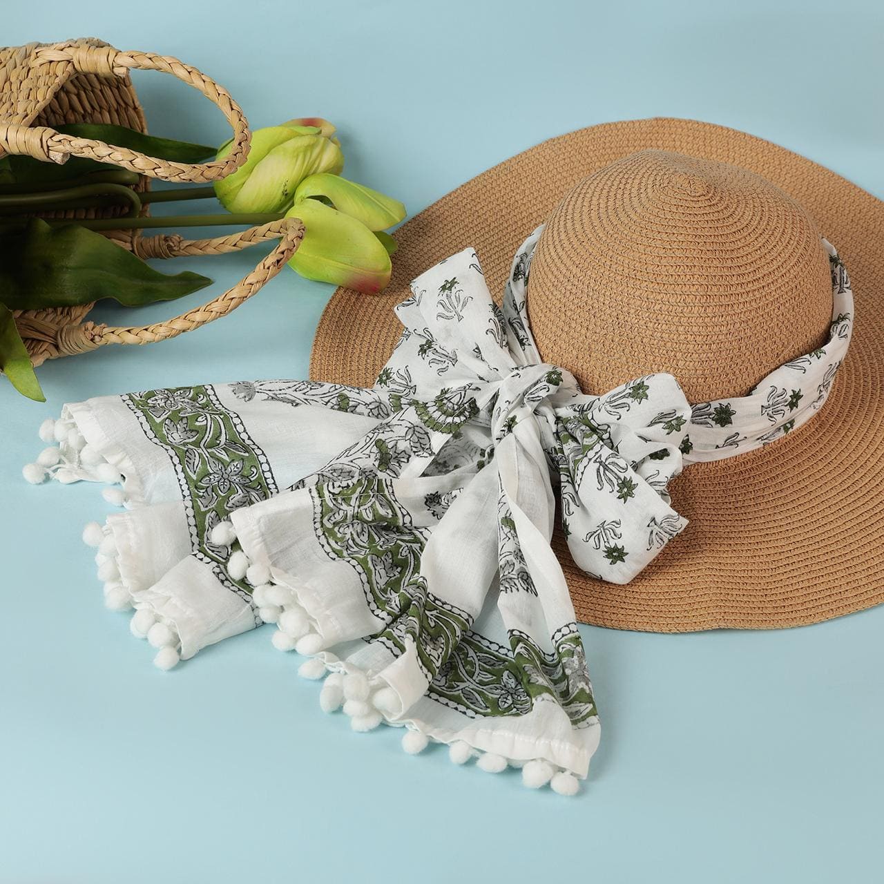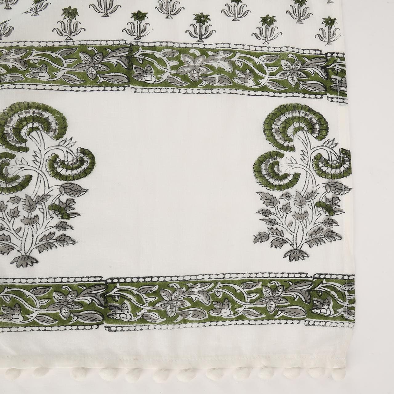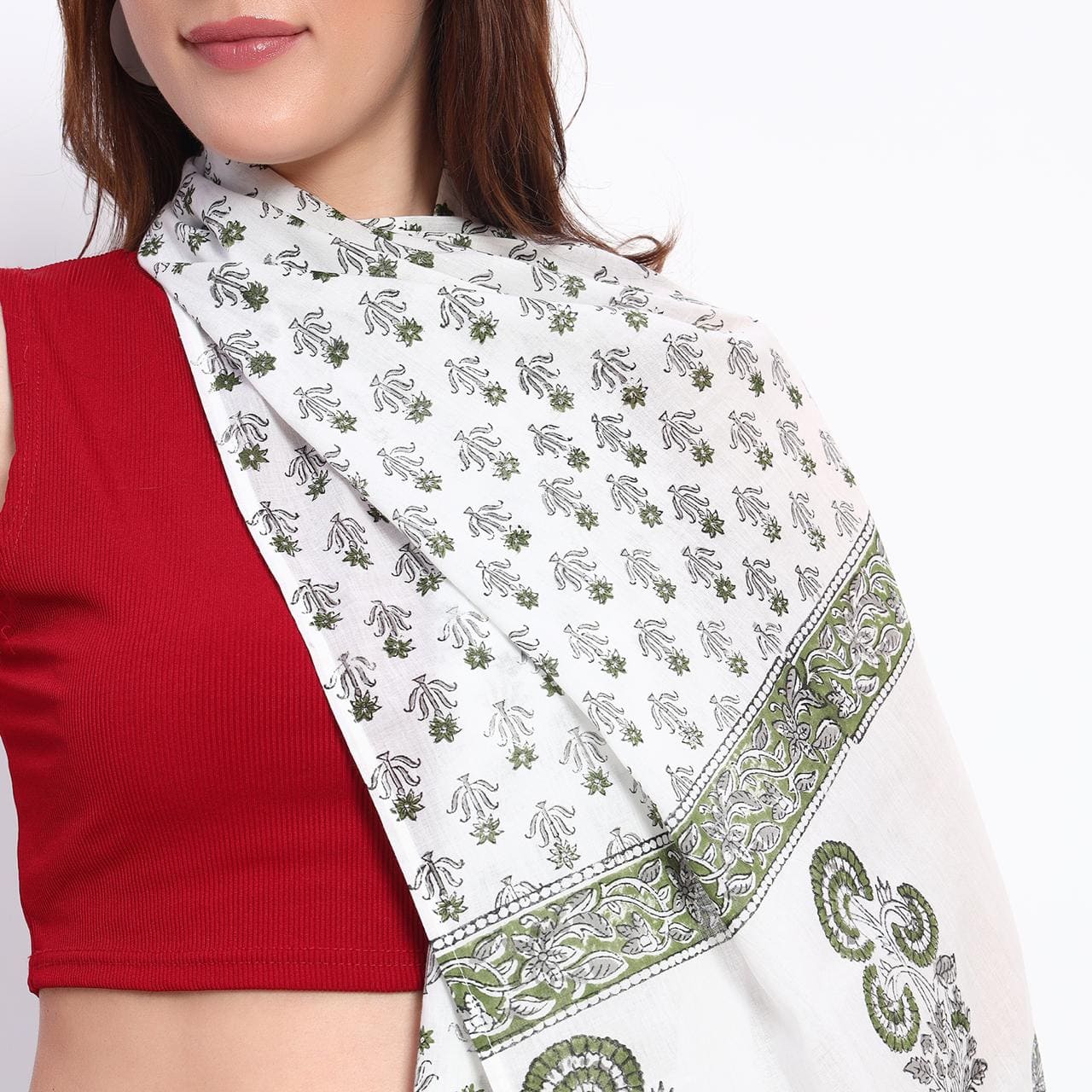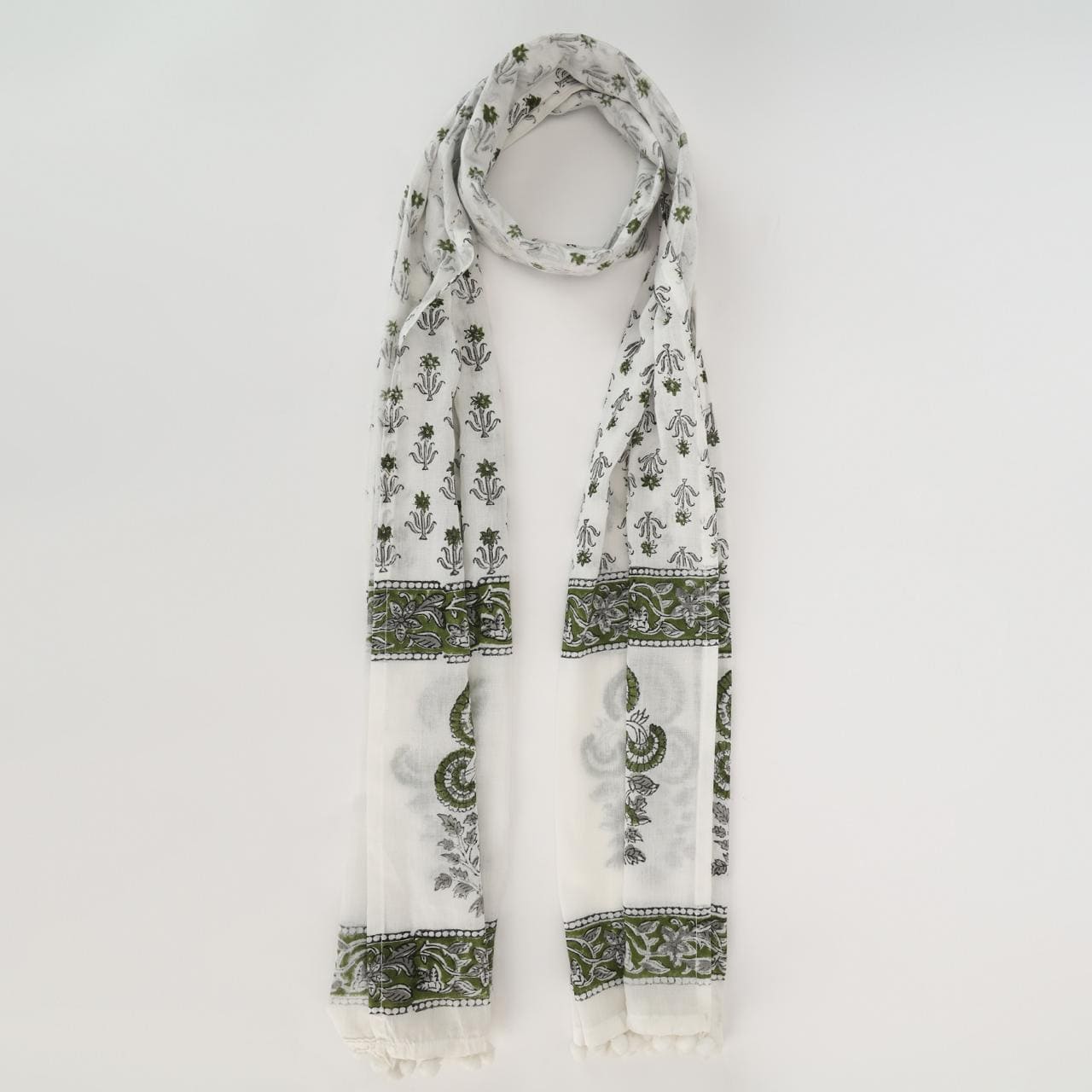 This stole is a masterpiece of understated sophistication, featuring a harmonious blend of intricate geometric patterns and delicate floral artistry. The soft, neutral palette with striking green accents adds a touch of refined elegance, making it a perfect accessory to complement both traditional and contemporary outfits. Lightweight and exquisitely crafted, it is designed to drape you in timeless charm.