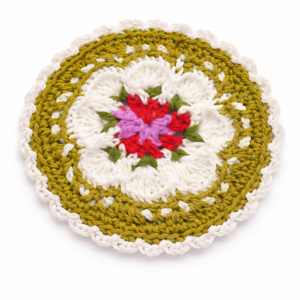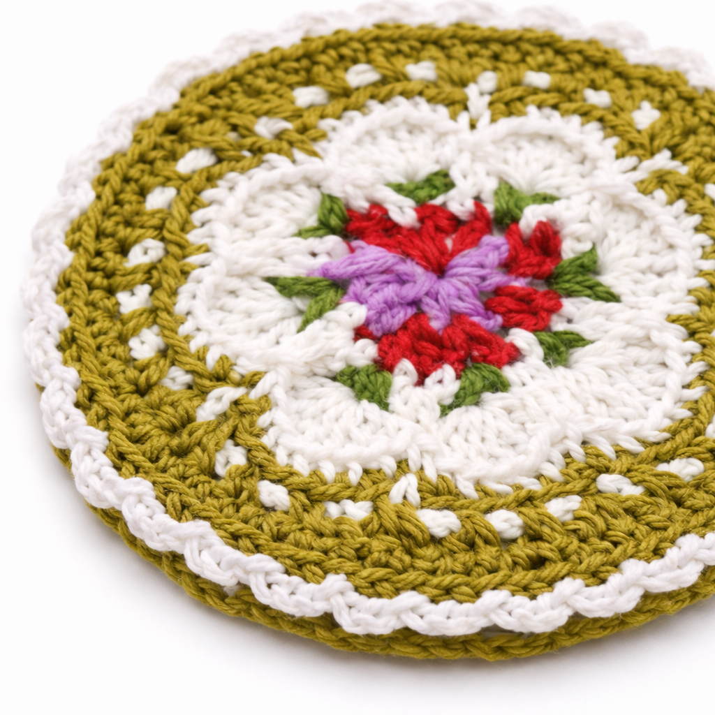 This olive green crochet doily coaster is handcrafted using soft cotton yarn and features a beautiful floral design at the center. The rich olive green crochet pattern paired with a delicate white lace border creates a sophisticated handmade table accessory. Designed for both decoration and functionality, this cotton yarn doily coaster protects table surfaces from heat, stains, and moisture while enhancing everyday table settings. Product Features Handcrafted crochet doily made from cotton yarn Decorative floral center crochet pattern Elegant olive green crochet design with white border Protects table surfaces from heat, stains, and cup marks Lightweight handmade decorative table accessory Material and Craftsmanship Material: Cotton yarn Technique: Hand crocheted Shape: Round Design: Floral crochet doily pattern Finish: Soft handcrafted cotton texture Usage Ideas Tea cup and coffee mug coaster Decorative doily for trays and table displays Accent mat for dining tables and coffee tables Handmade dcor accessory for kitchen and living spaces Care Instructions Hand wash gently with mild detergent and allow it to air dry flat to maintain the crochet pattern and cotton yarn quality. FAQs What material is used to make this crochet coaster? This coaster is handcrafted using durable cotton yarn. Can it be used for hot drinks? Yes, it works well as a coaster for tea cups, coffee mugs, and glasses. Will each handmade piece look identical? No. Because each piece is handcrafted, slight variations in crochet patterns may occur, making every item unique.