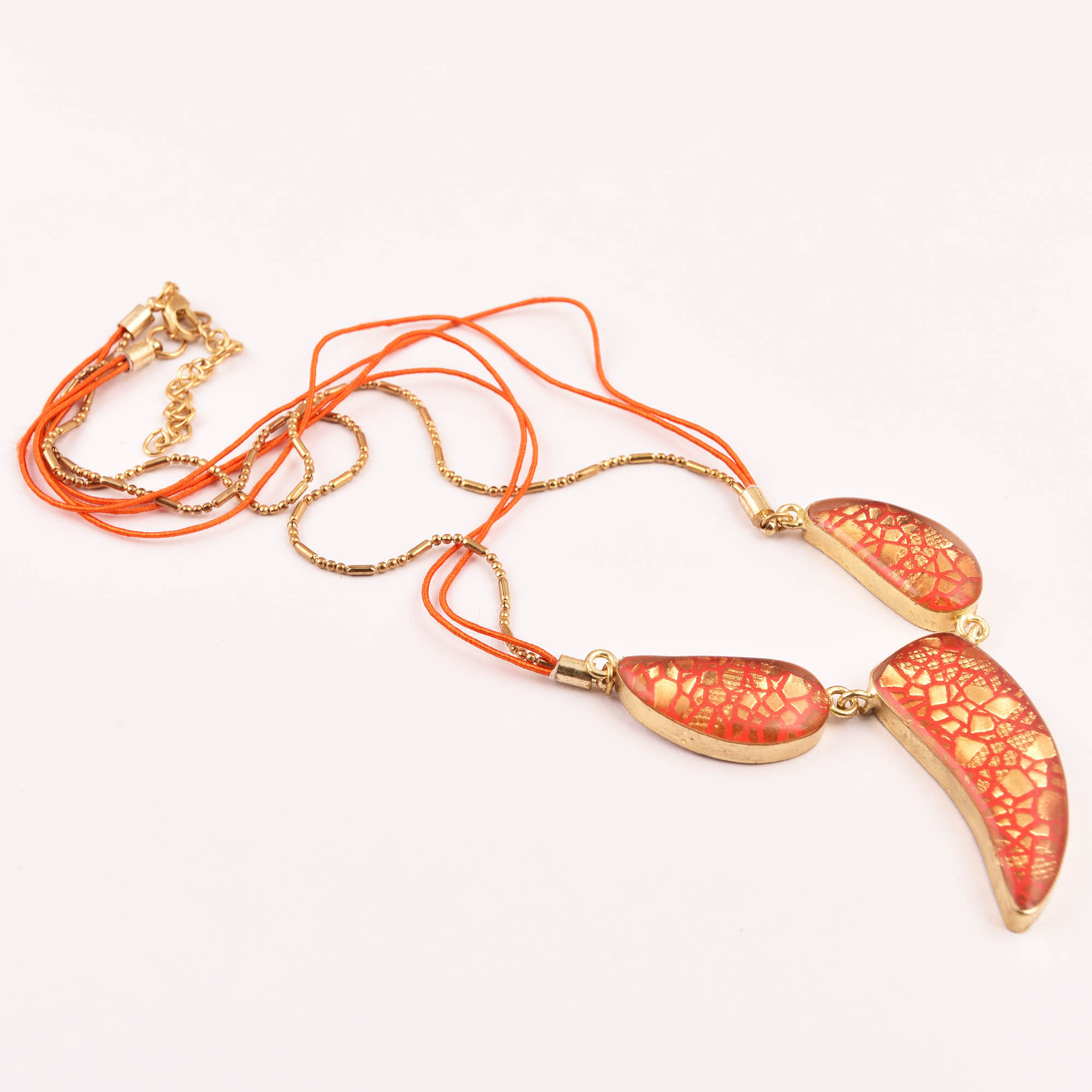 Orange and Gold Beabed Necklace New Beautiful Jewellery. Leather, Glass, Brass Chain and Brass Clasp.