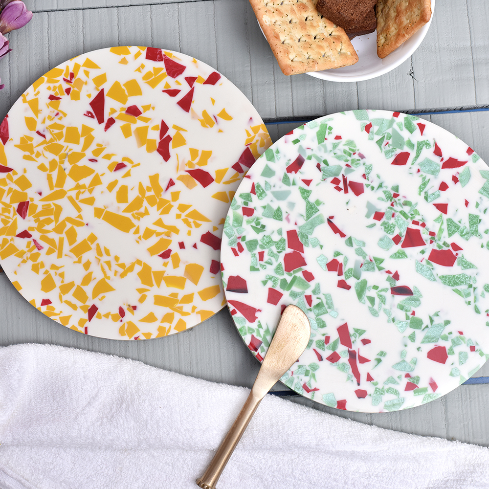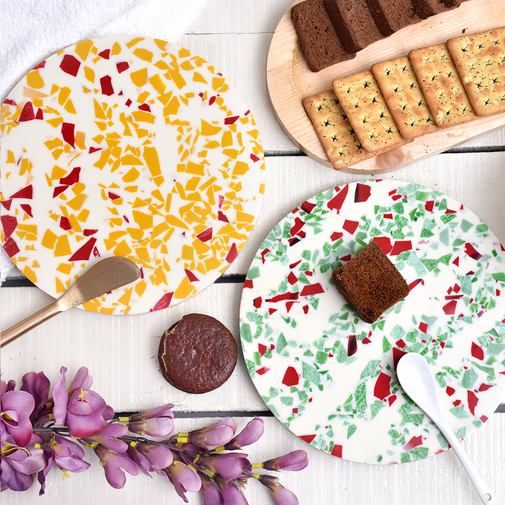The cake stand made of wood and resin is distinguished by its playful geometric shapes. One of the favorite materials to work with is terrazzo. It's colorful, fresh, and fun in the most understated way. Terrazzo was invented nearly 500 years ago in Italy as a way to reuse leftover marble from other constructions. This cake stand will add a retro-inspired feel to your living room. Although this cake stand will add a unique charm to your décor, it also has functionality for added appeal.
