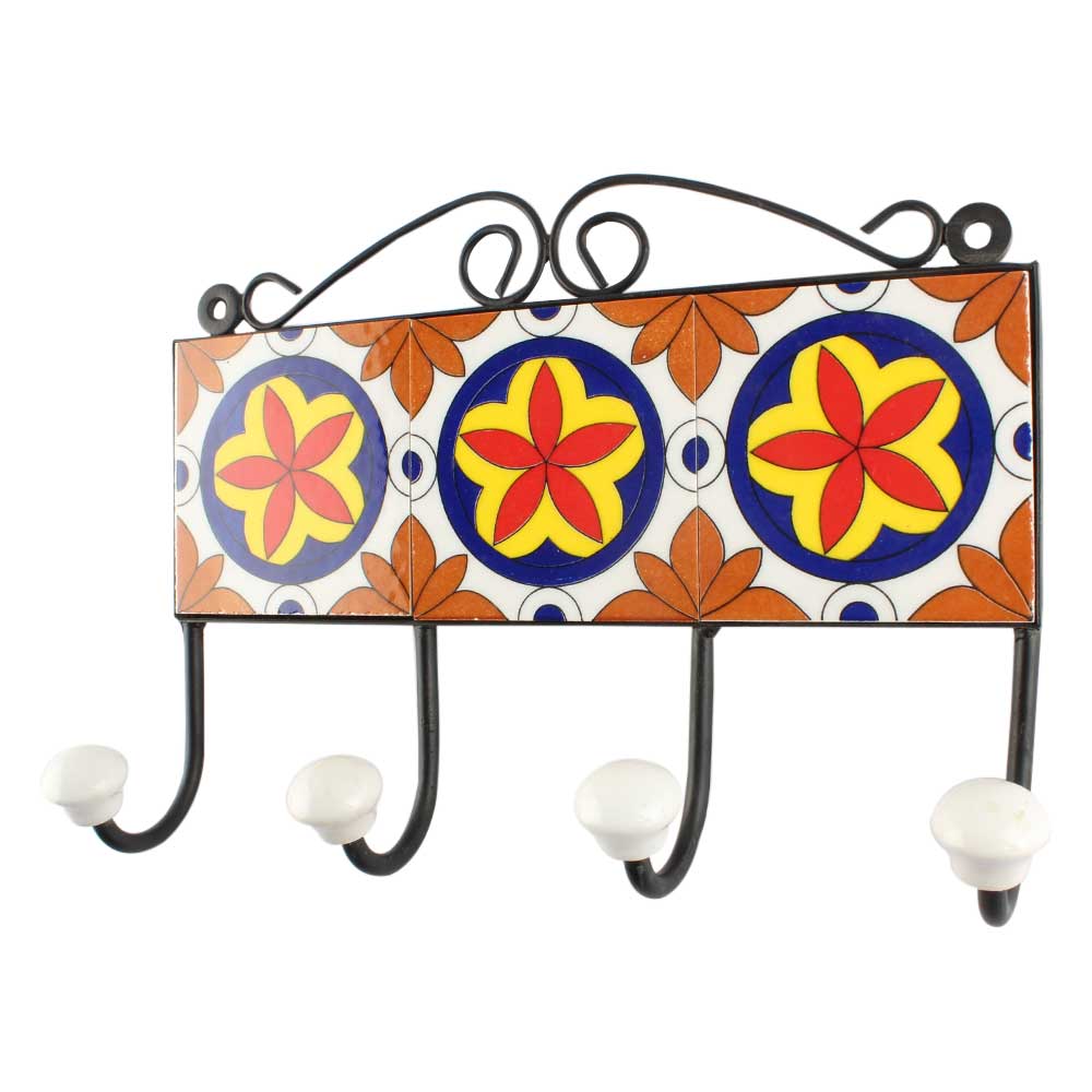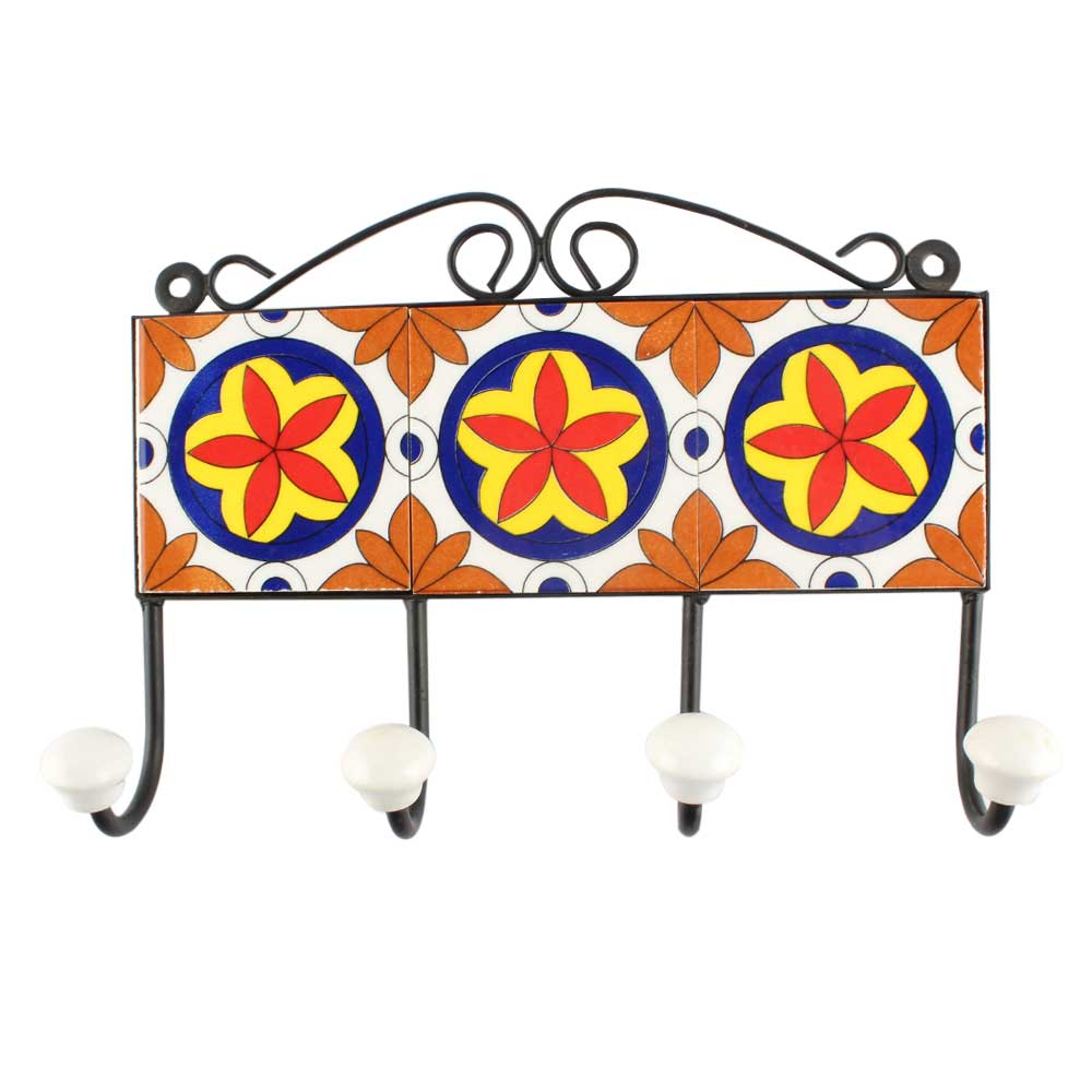 Orange Flower Ceramic Tile Hook. When Put on Wall or Cabinet It is An Art in Itself. The Metal Part of this Hook is Black Powder Coated.