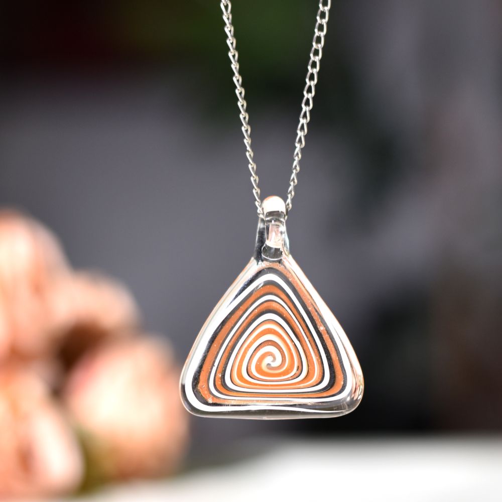 Ignite your jewelry designs with the warm glow of this Orange Spiral Triangle Lampwork Glass Pendant, a handcrafted symbol of creativity and balance. Made using the traditional lampwork technique, molten glass is shaped into a smooth triangular form and infused with spiraling orange patterns that shimmer like sunlight in motion. This radiant pendant adds energy, warmth, and artisan charm to any jewelry collection, making it perfect for both casual and statement creations.