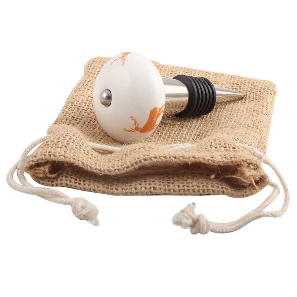 Orange Standing Rein Deer Pattern Ceramic Wine Stopper.zinc alloy wine bottle stopper with attractive Jute Bag Packaging.