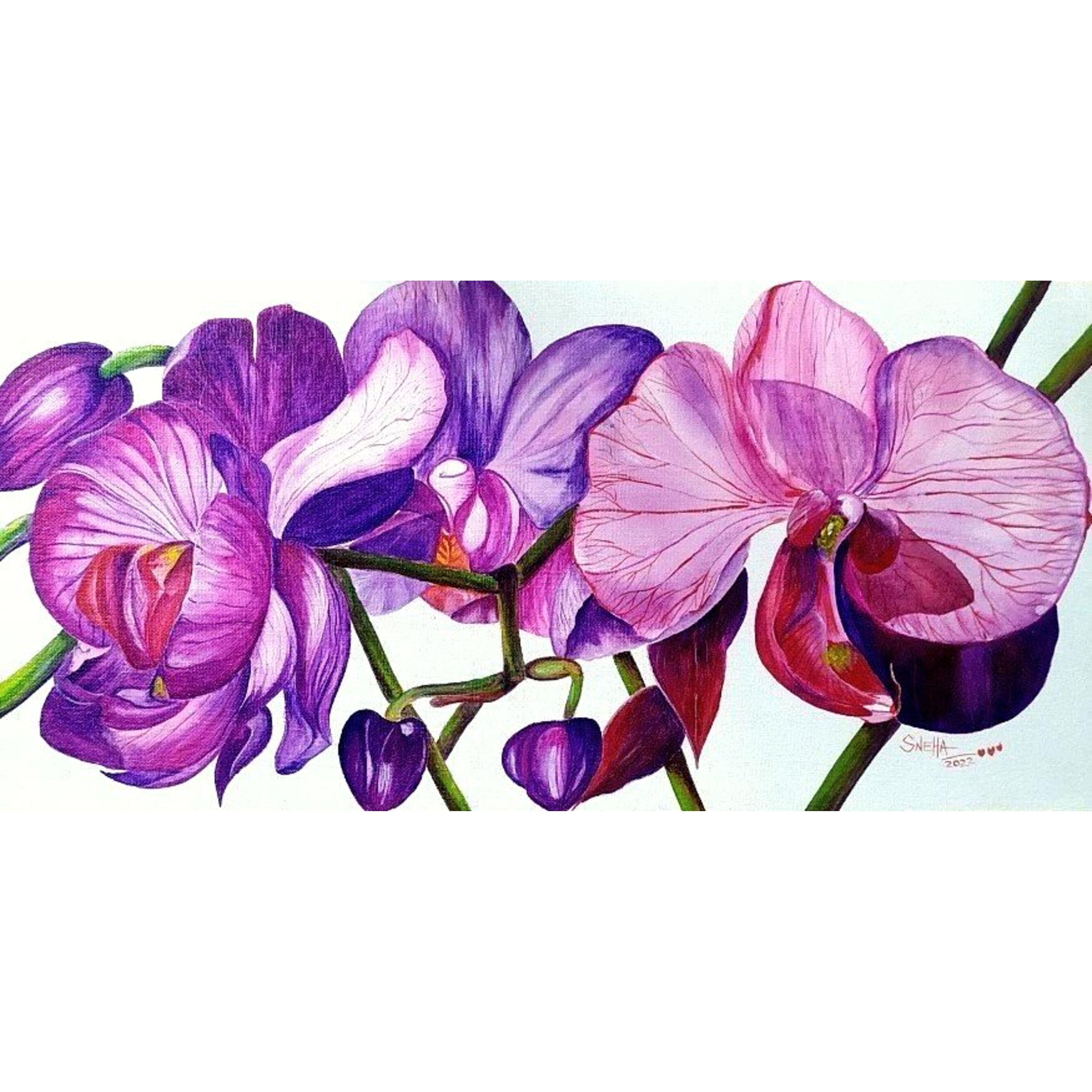 Delicate purple orchids bloom with quiet majesty, their petals curling like silk in the morning light. Each blossom carries a whisper of exotic elegance and tranquil mystery. This painting unveils grace in its purest form—vivid, poised, and quietly captivating.