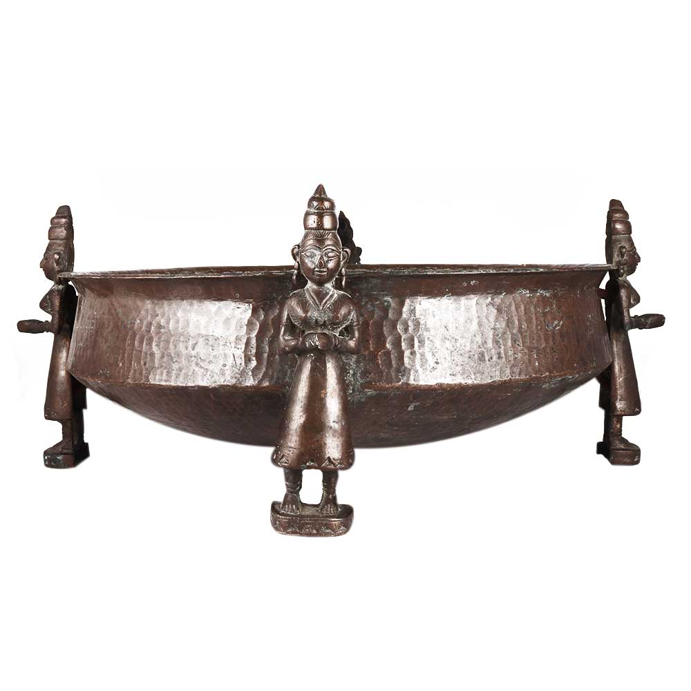 Your guests will be surprised in this way when they see this brass bath basin for god bath with hammered design and medieval finish. The copper bowl is adorned with male figurines along the border, giving it an elegant appearance. On the outside, it has an exquisitely hand beaten design. When gifted, this great masterpiece would be a promising perquisite. Excellent gift for Deepavali, Karthigai dheepam, upanayanam, and weddings.