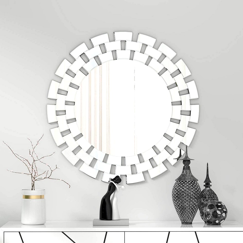 Infuse your interiors with elegance through this clear glass mosaic frame mirror featuring a radiant circular design crafted with layered geometric tiles. Its reflective brilliance and handcrafted precision make it a timeless accent for any décor. Packed & quality-checked by Indianshelf.