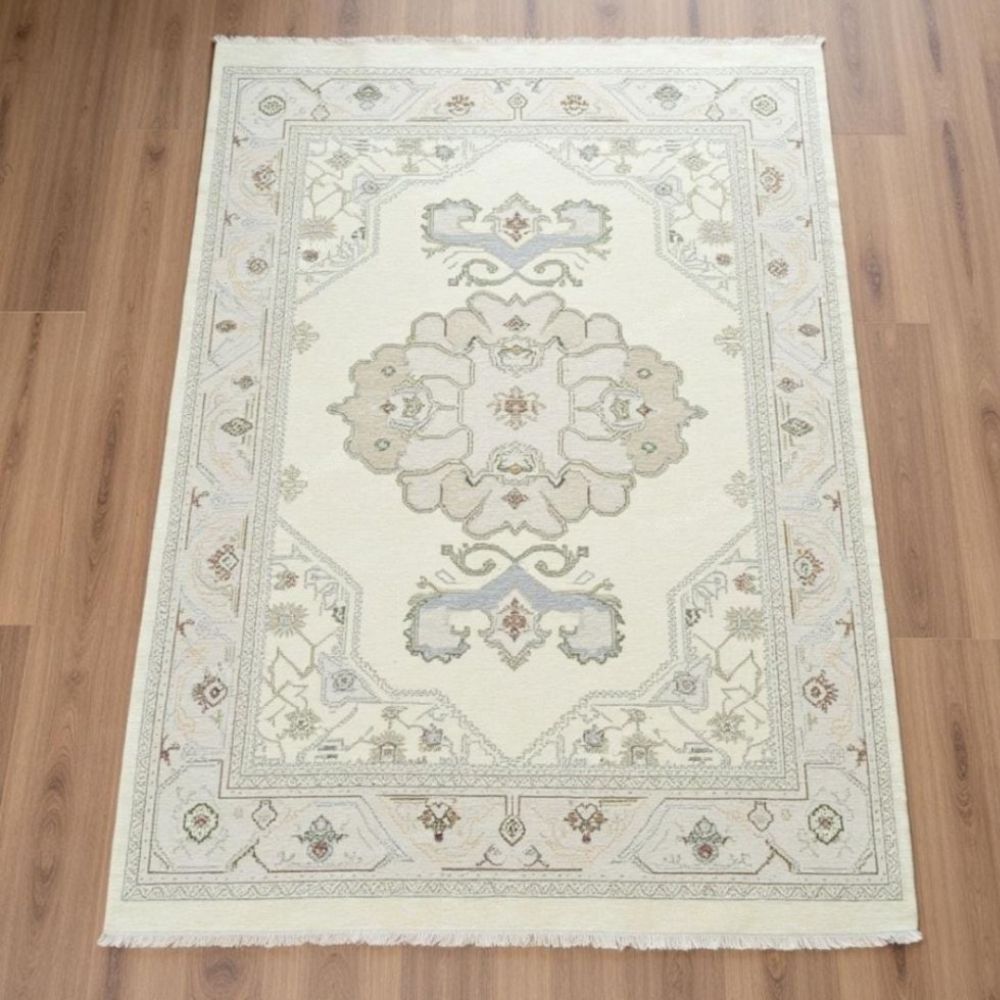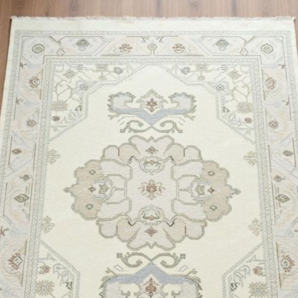 Elevate your space with this exquisite Light Ivory Oushak Wool Rug, handmade by seasoned artisans in Bhadohi, India, renowned worldwide for premium hand-knotted rugs. Inspired by the subtle elegance of Turkish Oushak motifs, this rug features a large central medallion flanked by intricate floral and geometric details all in soothing ivory, soft beige, sage green, and faded terracotta tones. Perfect for buyers seeking light, airy, and timeless floor coverings, this rug adds quiet sophistication to both traditional and modern homes. It complements light-toned wood floors, neutral furniture, and soft interior palettes beautifully. We welcome custom orders message us with your size. Why This Rug? We can create your dream rug Eco-friendly Material: Natural wool helps regulate temperature and reduces allergens indoors Customization Options: We specialize in custom rugs if youd like this design in a different size, shape, or color palette to match your home perfectly, just message us. We also offer bulk pricing for interior designers and home projects. Care Instructions: Vacuum regularly. Spot clean with a damp cloth. Use a rug pad underneath for added grip and longevity.