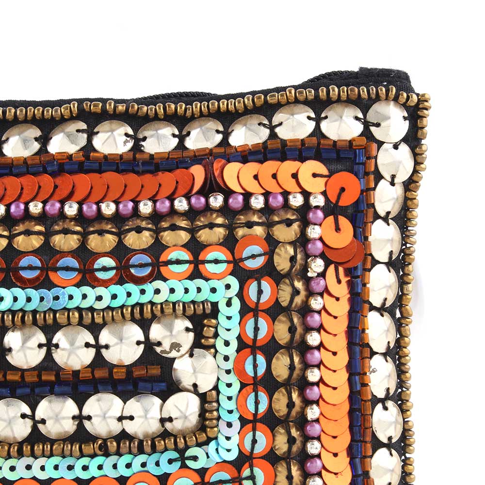 Handmade cotton fabric gorgeous oversized clutch bag with silver coin and bronze metal hardware from the roaming gypsy tribes of India. It has a detachable chain strap top zipped closure an open inner pocket.